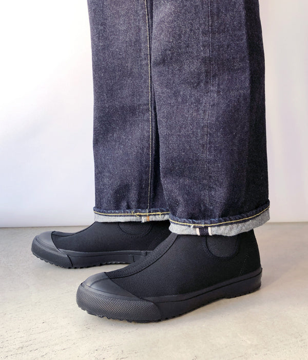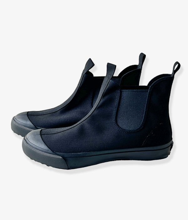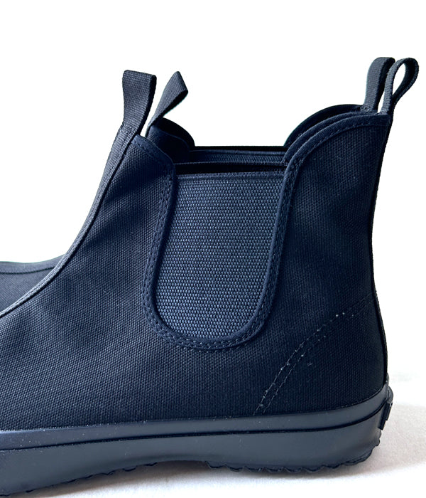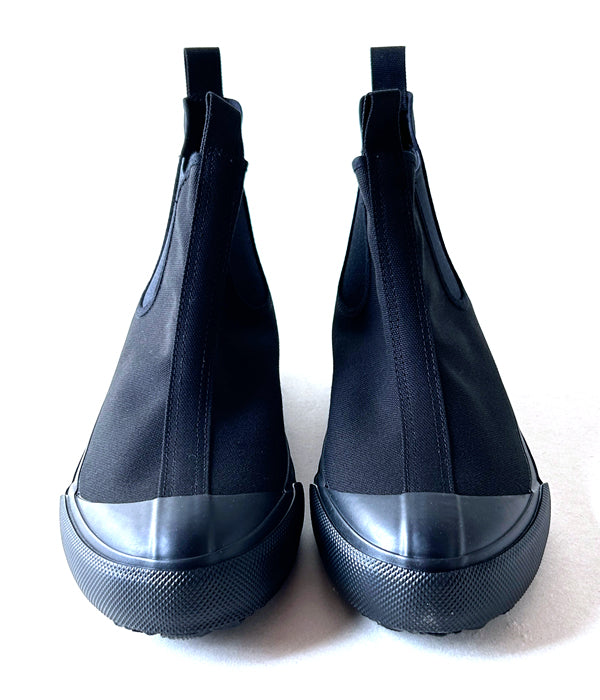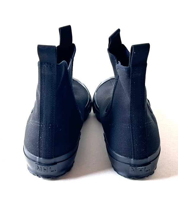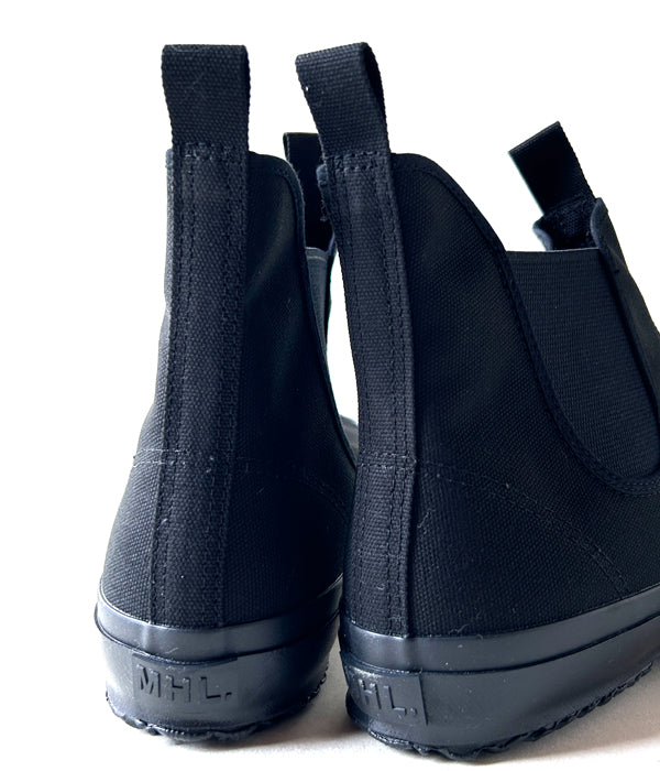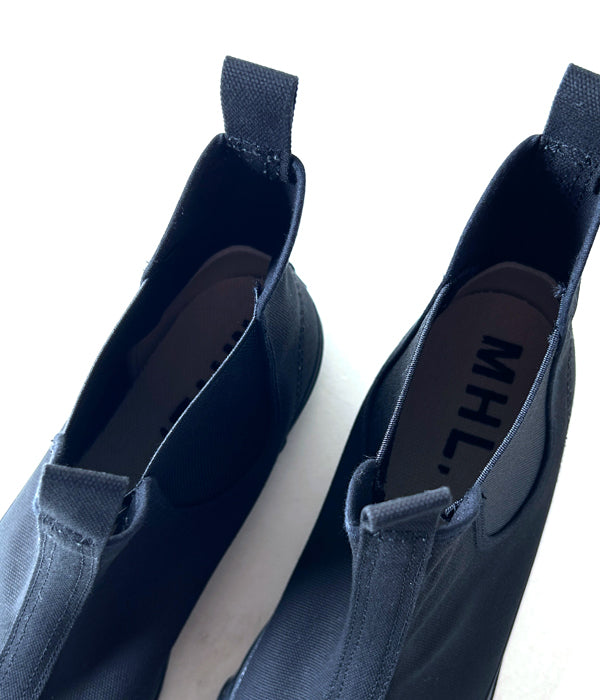 MHL.から、CHELSEA BOOTが入荷しました。タフな作りの厚手のコットンキャンバス生地を使用したチェルシーブーツ。サイドゴアのバランスがよく着脱しやすく、フロントのテープがデザイン性を高めます。クッション性の高いカップインソールを敷いていて履き心地も良好です。