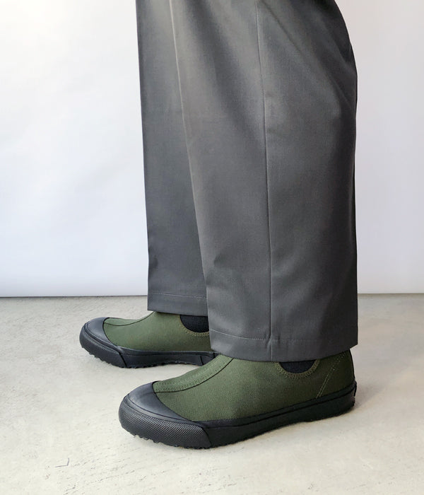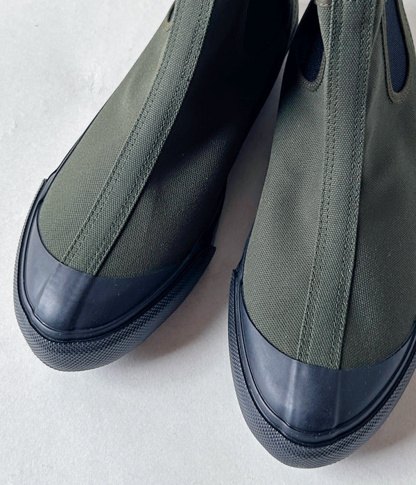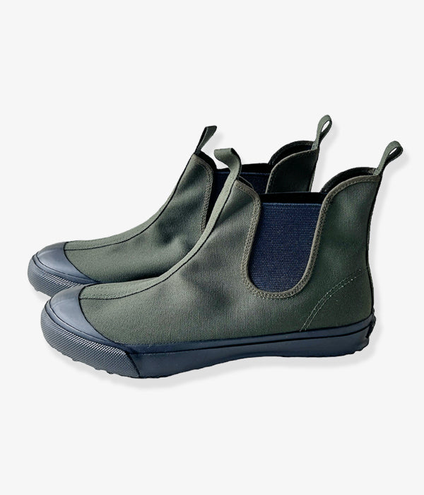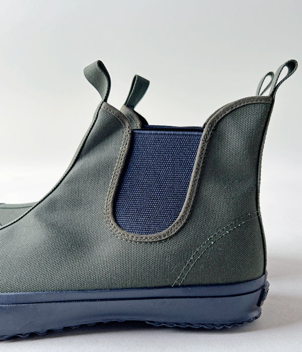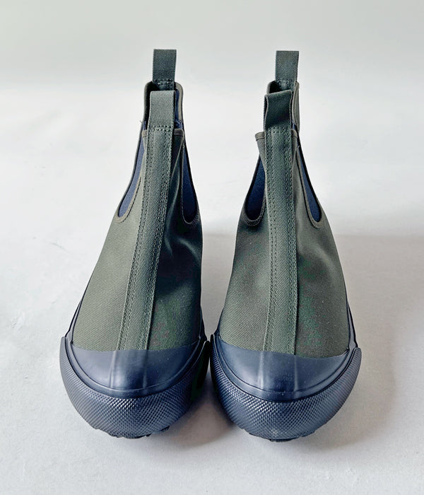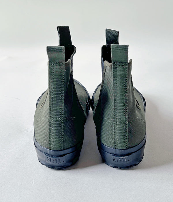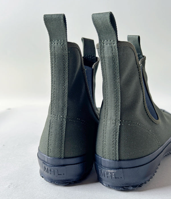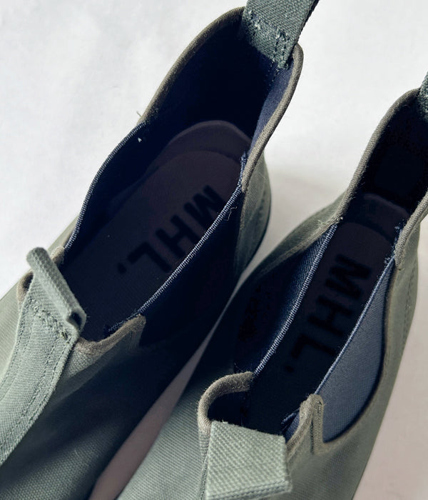MHL.から、CHELSEA BOOTが入荷しました。タフな作りの厚手のコットンキャンバス生地を使用したチェルシーブーツ。サイドゴアのバランスがよく着脱しやすく、フロントのテープがデザイン性を高めます。クッション性の高いカップインソールを敷いていて履き心地も良好です。