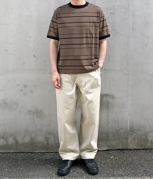 MHL.から、COTTON LINEN STRIPE JERSEY SSが入荷しました。コットンリネンのミックスジャージー素材によるボーダーTシャツ。襟周りと袖口にコントラストカラーのフライス生地を当てがったリンガーデザインに、異なる幅でデザインされたワイドピッチなストライプがポイント。両サイドにスリット入り。