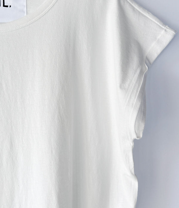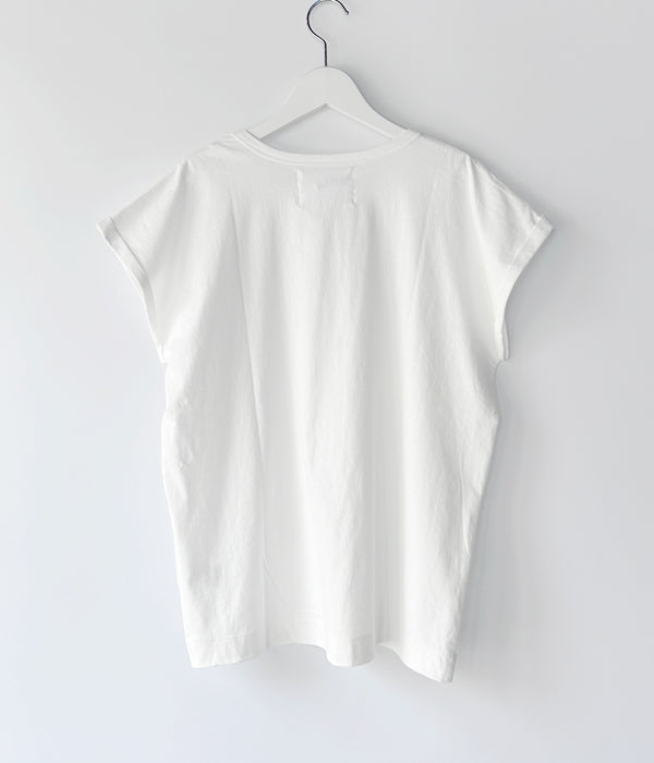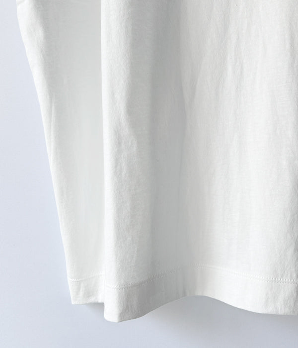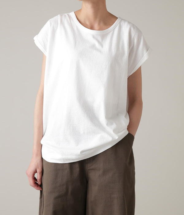 MHL.から、FINE COTTON JERSEY SS WOMENSが入荷しました。ドライタッチな薄手の天竺ジャージー素材を使用し、やや長めの着丈に、折り返しをロールアップ仕立てにアレンジしたフレンチスリーブ型の半袖Tシャツ。ゆったりとしたサイジングで一枚での着用から、インナーとしても使える定番の1着。
