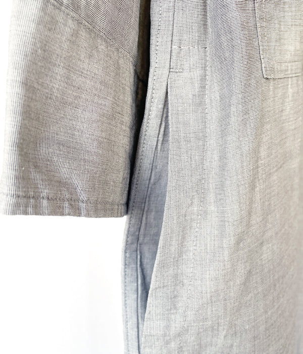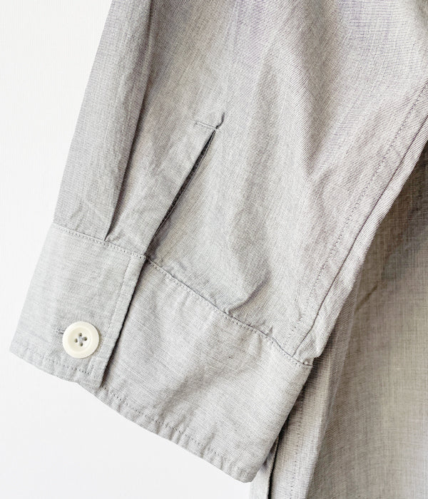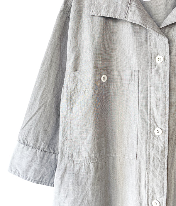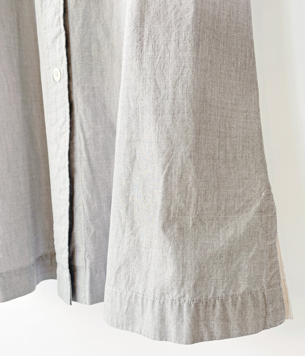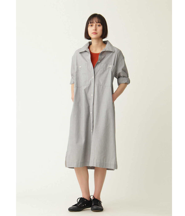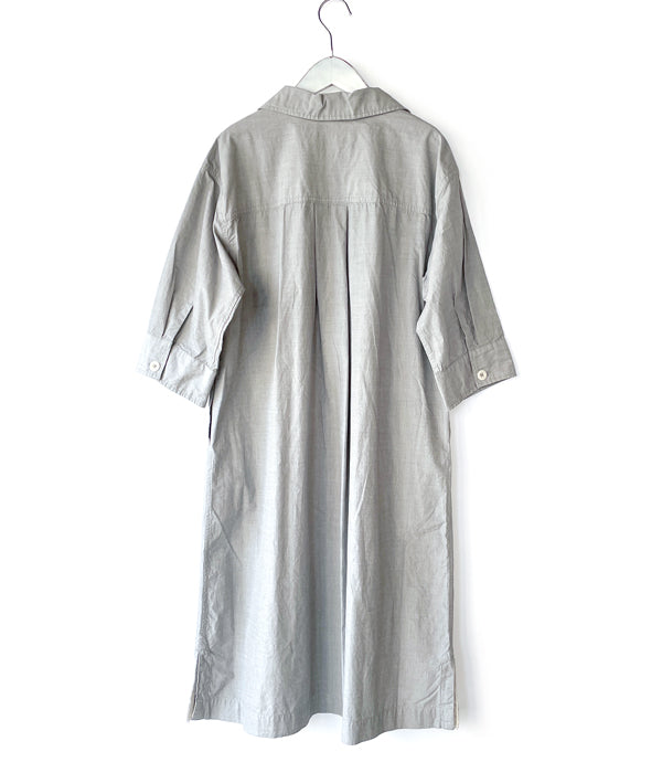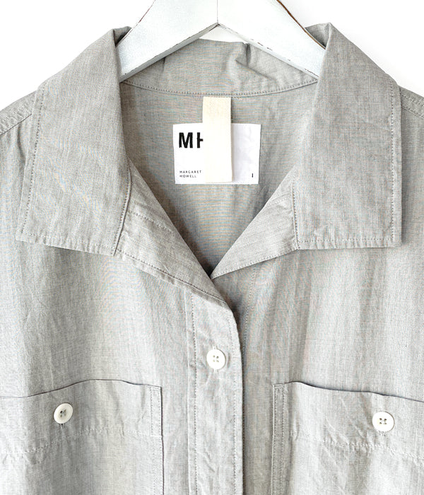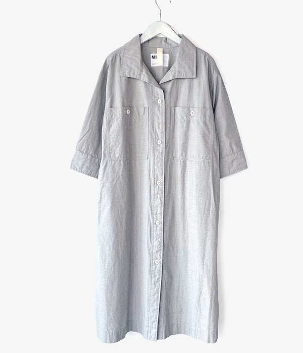 MHL.から、HIGHCOUNT COTTON END ON END OPが入荷しました。コシがあるしっかりとしたコットン素材を使用したカジュアルなドレスワンピース。第一ボタンをやや低めに設計したラフな抜け感のあるオープンカラーの襟元、大きなボタンと、大きなバストポケットもカジュアル感を演出します。サイドにポケットを備えます。