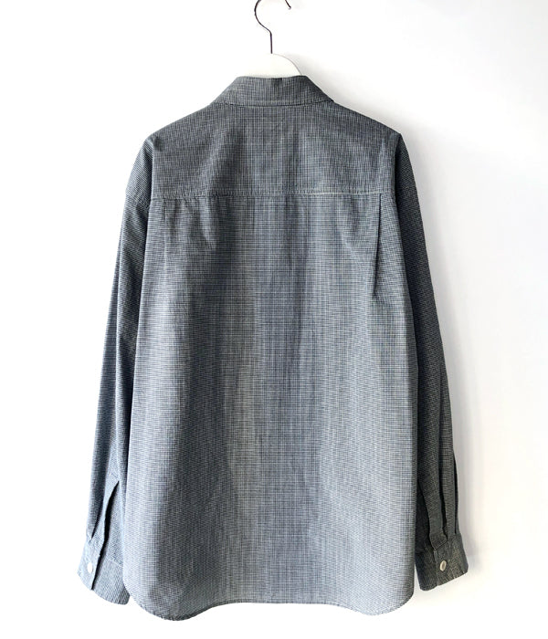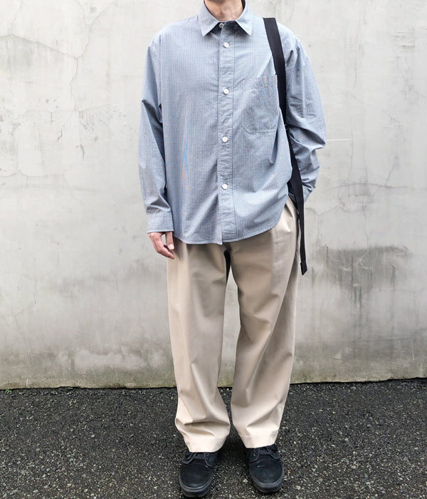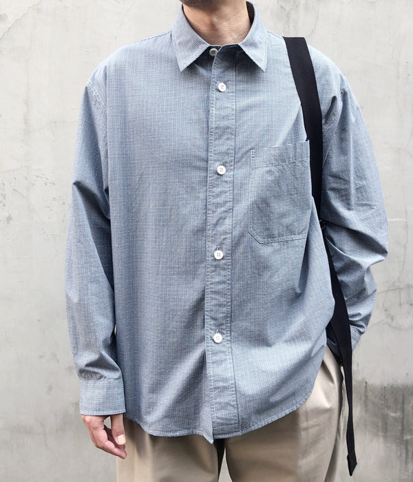 MHL.から、TINY GINGHAM COTTON SHIRTが入荷しました。ブルーを基調とした細かなギンガムチェック柄のコットン製のシャツ生地を使用したレギュラーカラーシャツ。大きめのボタンとポケット、存在感のあるカフスがポイントです。サイドタック仕様のゆったりとしたサイジングに仕立てました。