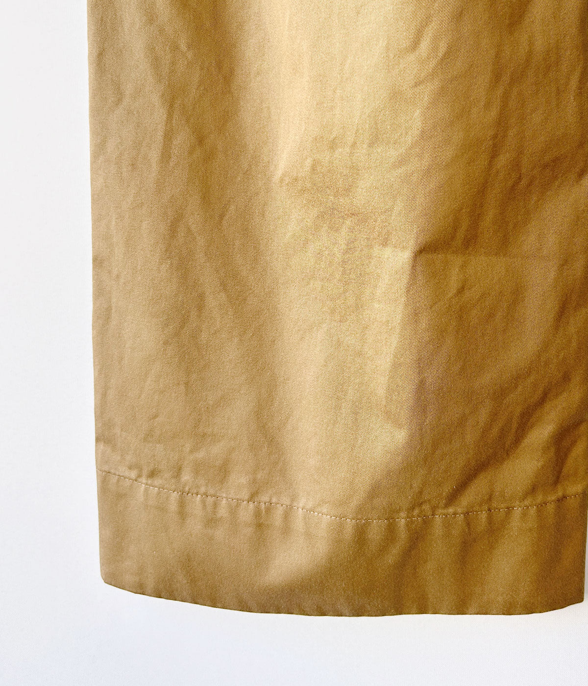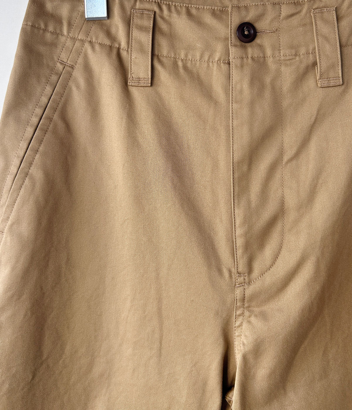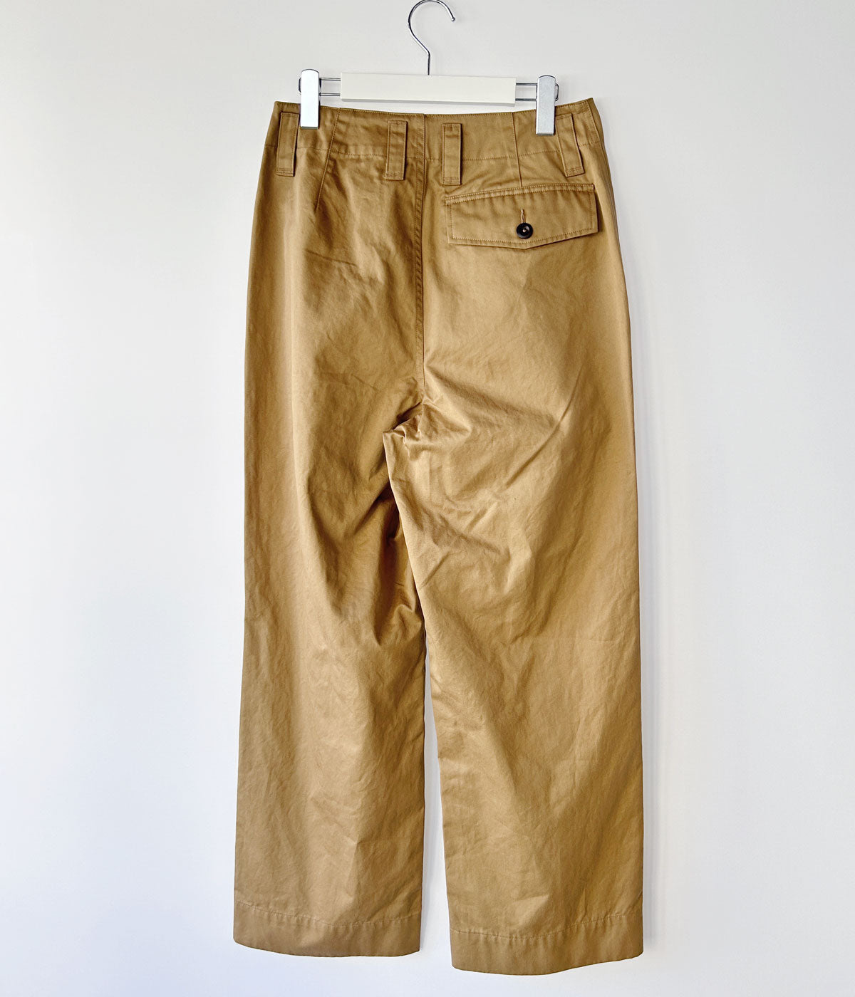 MHL.から、WASHED CHINO COTTON TROUSERS WOMENSが入荷しました。高密度で丈夫に織り上げたチノクロスを使用した、ベイカーパンツのようなワイドストレートシルエットのトラウザース。ガシッとした質感ですが、着用と洗いを重ねるごとに柔らかく馴染み、風合いが増し愛着が湧いてきます。切り替えに沿った腰ポケット、大きなフラップポケットや無骨なベルトループの配置など、ワークテイストのデザインが目を惹きます。