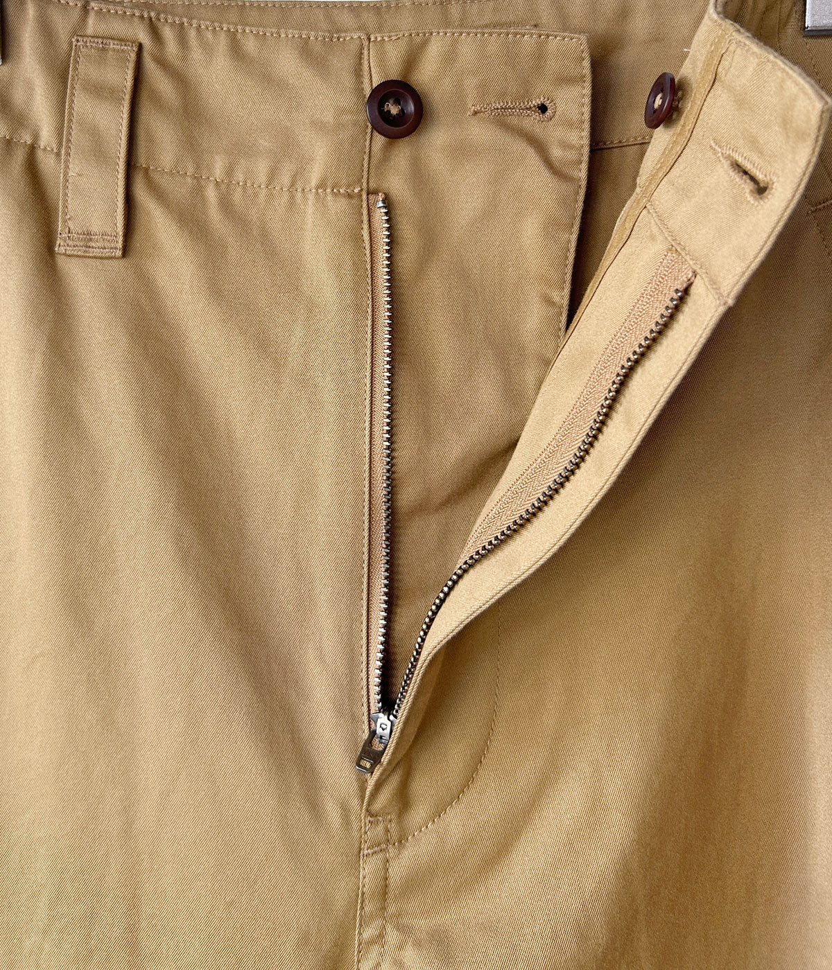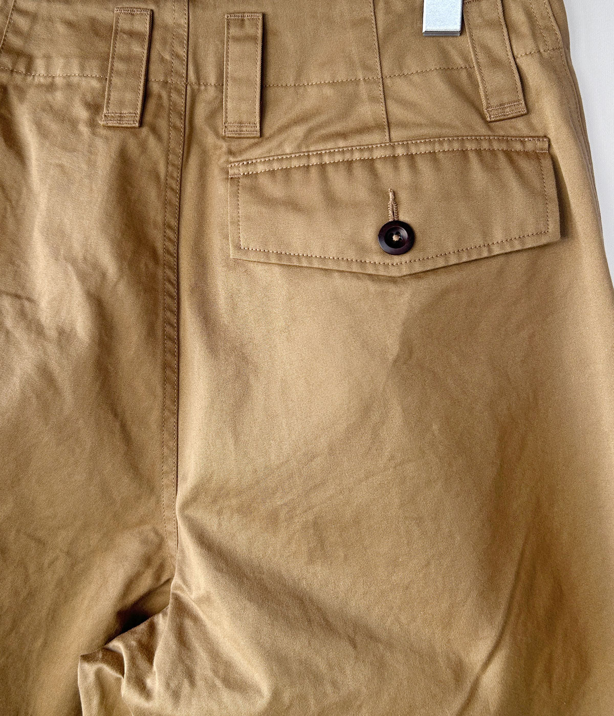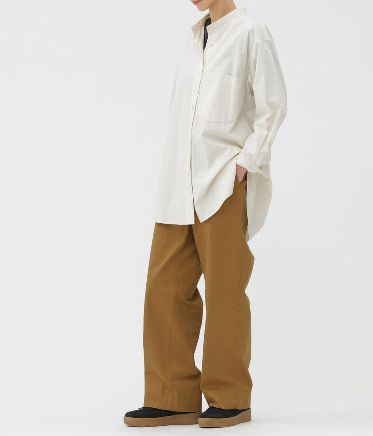 MHL.から、WASHED CHINO COTTON TROUSERS WOMENSが入荷しました。高密度で丈夫に織り上げたチノクロスを使用した、ベイカーパンツのようなワイドストレートシルエットのトラウザース。ガシッとした質感ですが、着用と洗いを重ねるごとに柔らかく馴染み、風合いが増し愛着が湧いてきます。切り替えに沿った腰ポケット、大きなフラップポケットや無骨なベルトループの配置など、ワークテイストのデザインが目を惹きます。