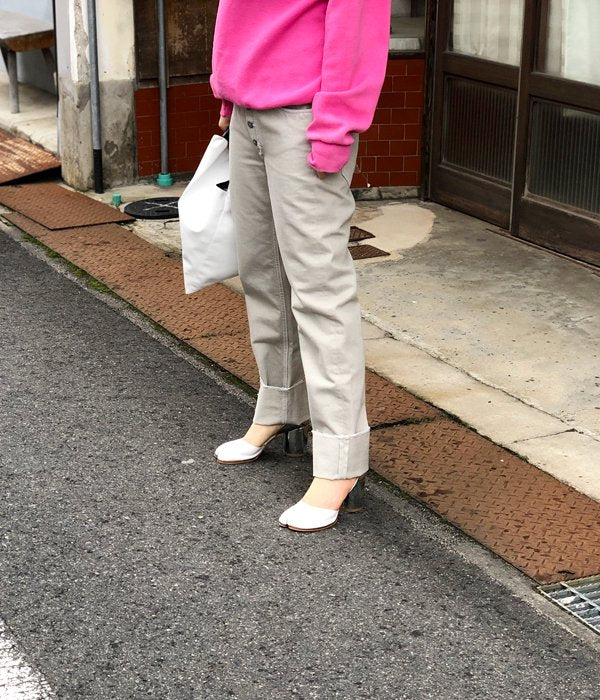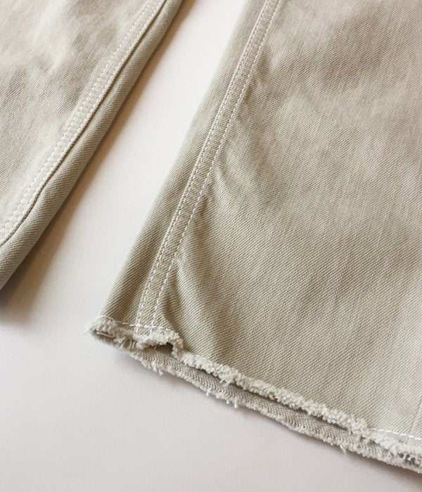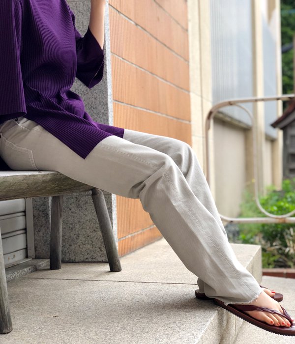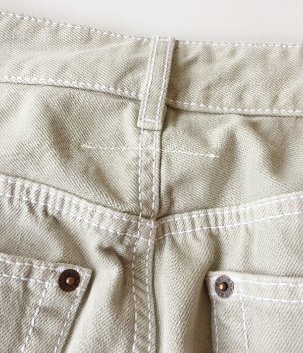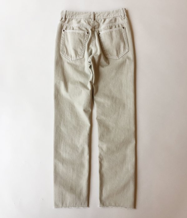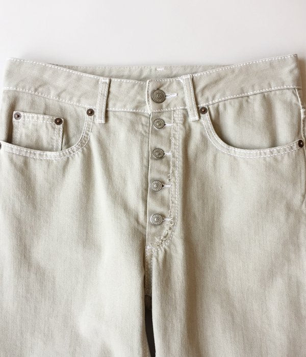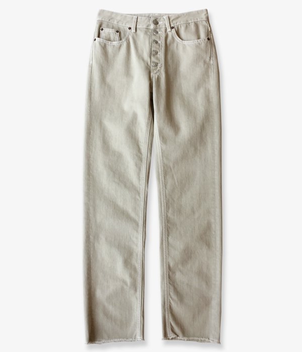 フロントのボタンフライがポイントのデニムパンツ。裾に向かって緩やかに細くなりフィットするシルエットは美脚効果あり。グレーとベージュが混ざったようなニュアンスカラーは、幅広いコーディネートに取り入れやすく洗練されたスタイルに格上げしてくれます。