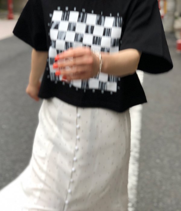 歴史深いボードゲーム"チェッカー"の市松模様がプリントされたショート丈のS/S TEE。ボードを囲む文字がゲームで使う駒の様にも見えるデザイン。昔よく遊んだあの頃を彷彿させるノスタルジックな一枚です。