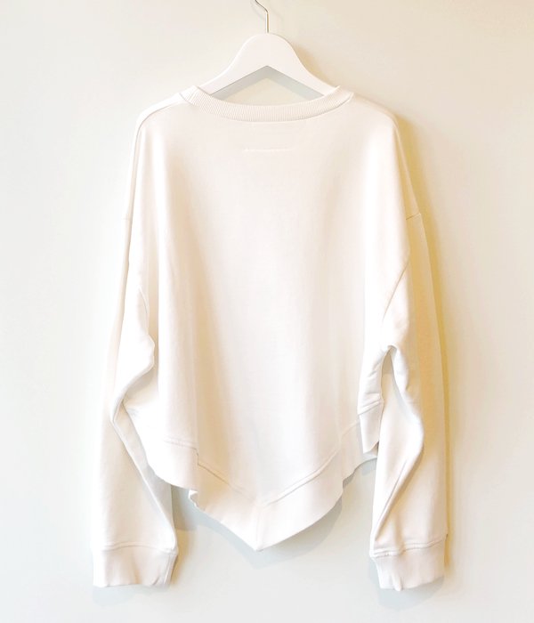 MM6 MAISON MARGIELAからCOTTON SWEATSHIRT(WHITE)が入荷しました。ヘムラインがV字にカットされているコットンスウェットシャツ。オーバーサイズな肩と袖、ゆったりとした身幅とのバランスが面白い。着用するとV字のラインで立体的なシルエットに。短めのサイドからはインナーを覗かせたり、シャツやワンピースとレイヤードする着こなしもおすすめです。