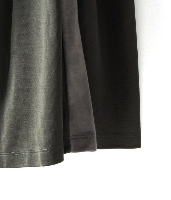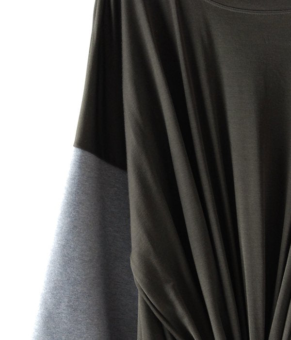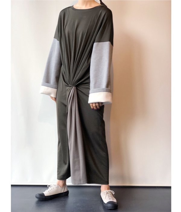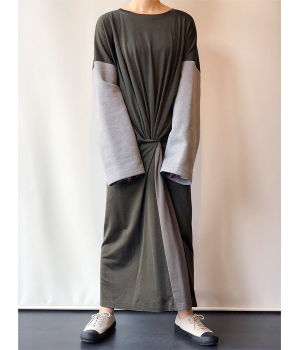 スウェットシャツの袖がドッキングしたワンピース。 フロントのドレープが表情豊かに見せてくれます。フレアな袖とアシンメトリーな裾でリラックスしたシルエット。1枚で様になるアイテムです。