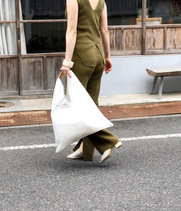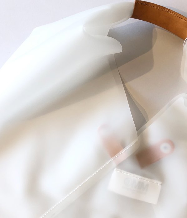風呂敷から発想を得たJAPANESE TOTE BAG。MM6のロゴがプリントされたマットなPVC素材を使用し軽量ながら、A4サイズもすっぽり収納する大容量に。インナーポケットも完備し、底部のスナップボタンでフォルムを変えられる面白いデザイン。