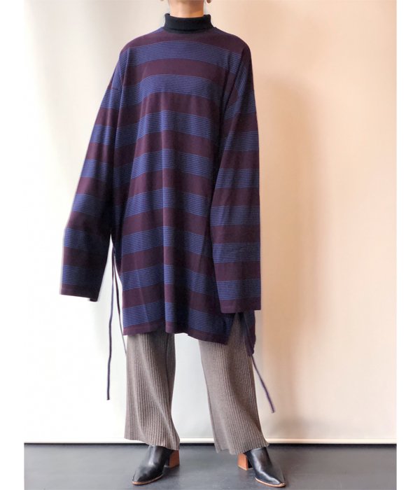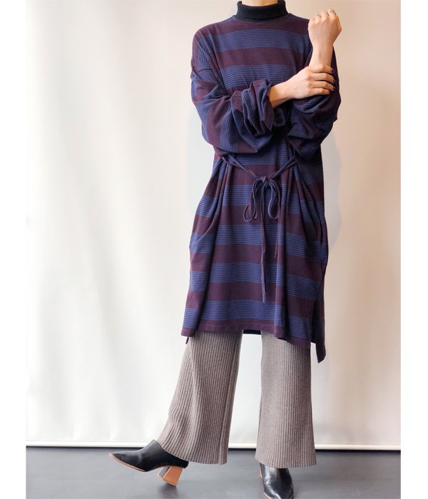 バイオレットとブルーのストライプ柄に、コントラストを生み出すブラックのタートルネックでバランスをとったドレス。ルーズなカット、オーバーサイズの袖が特徴です。ゆるめに着こなすことも、ウエストを絞ってフィットしたシルエットでも着用可能。