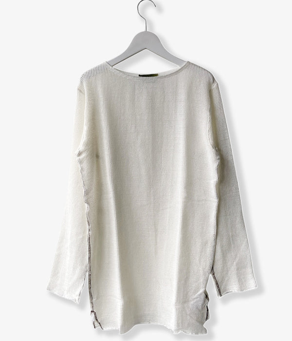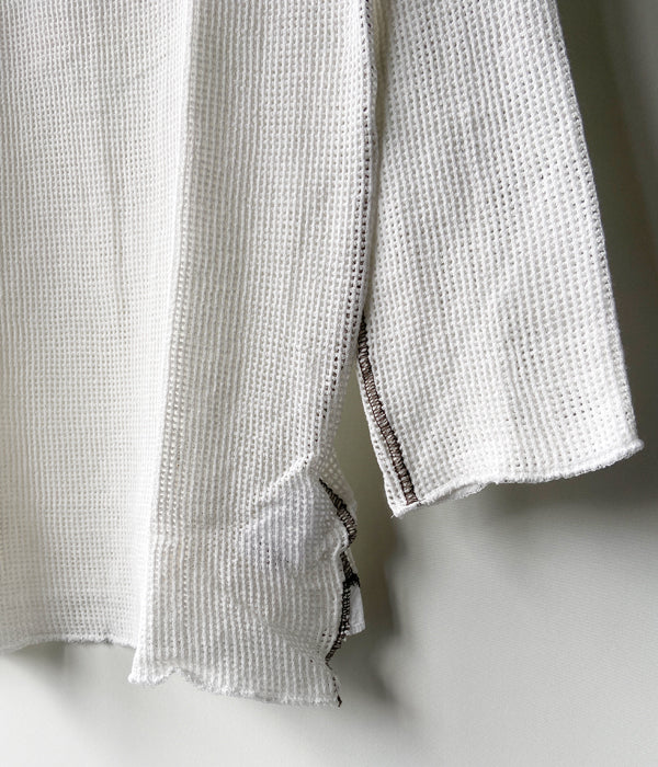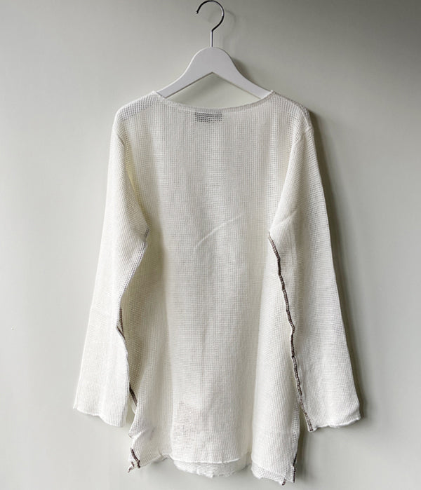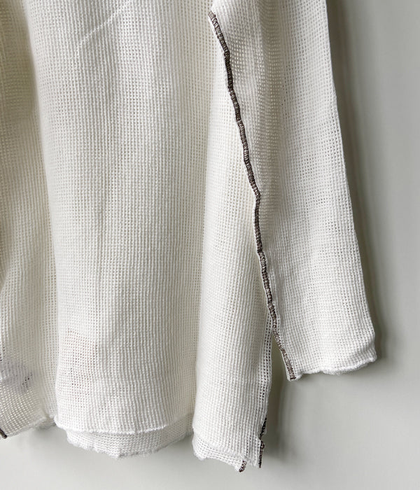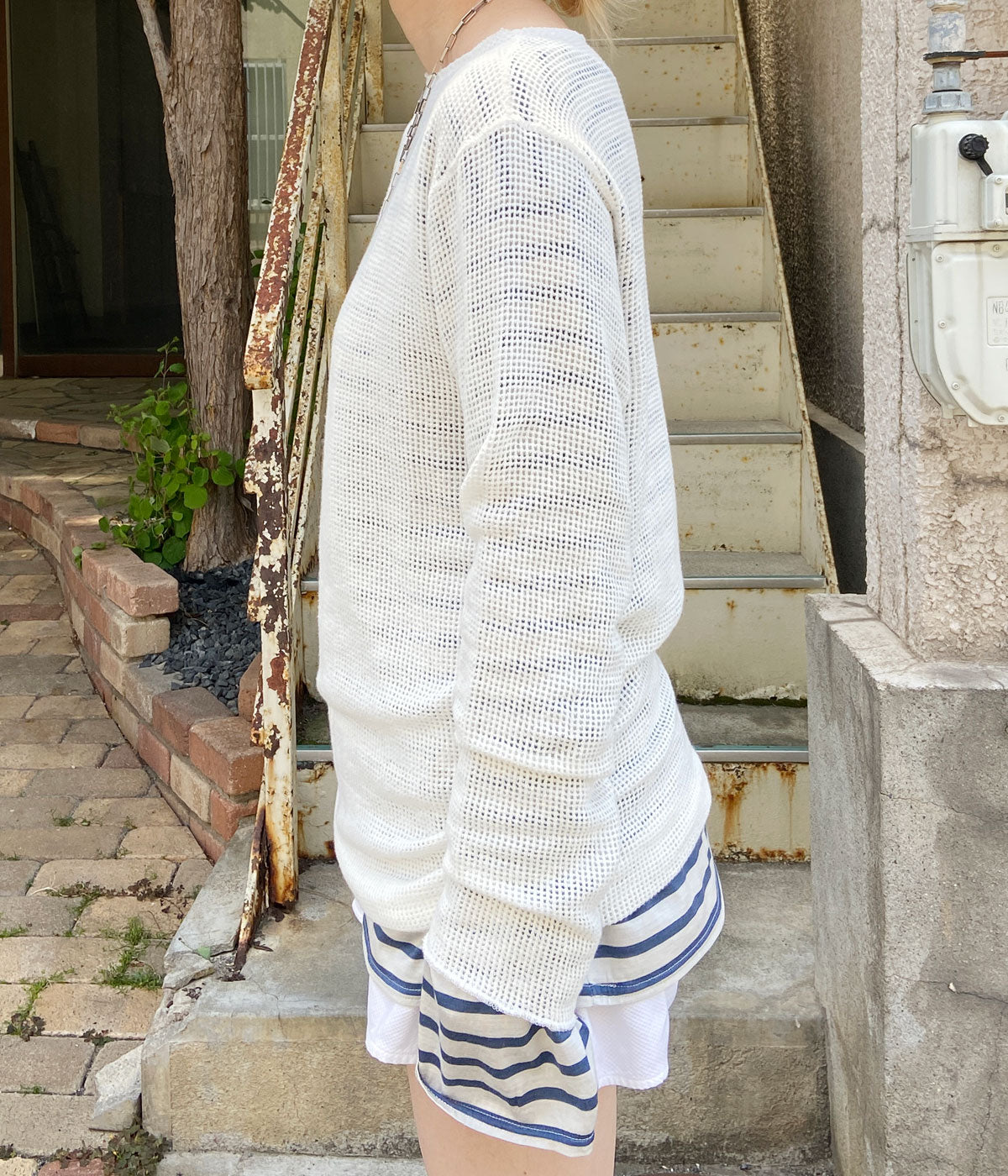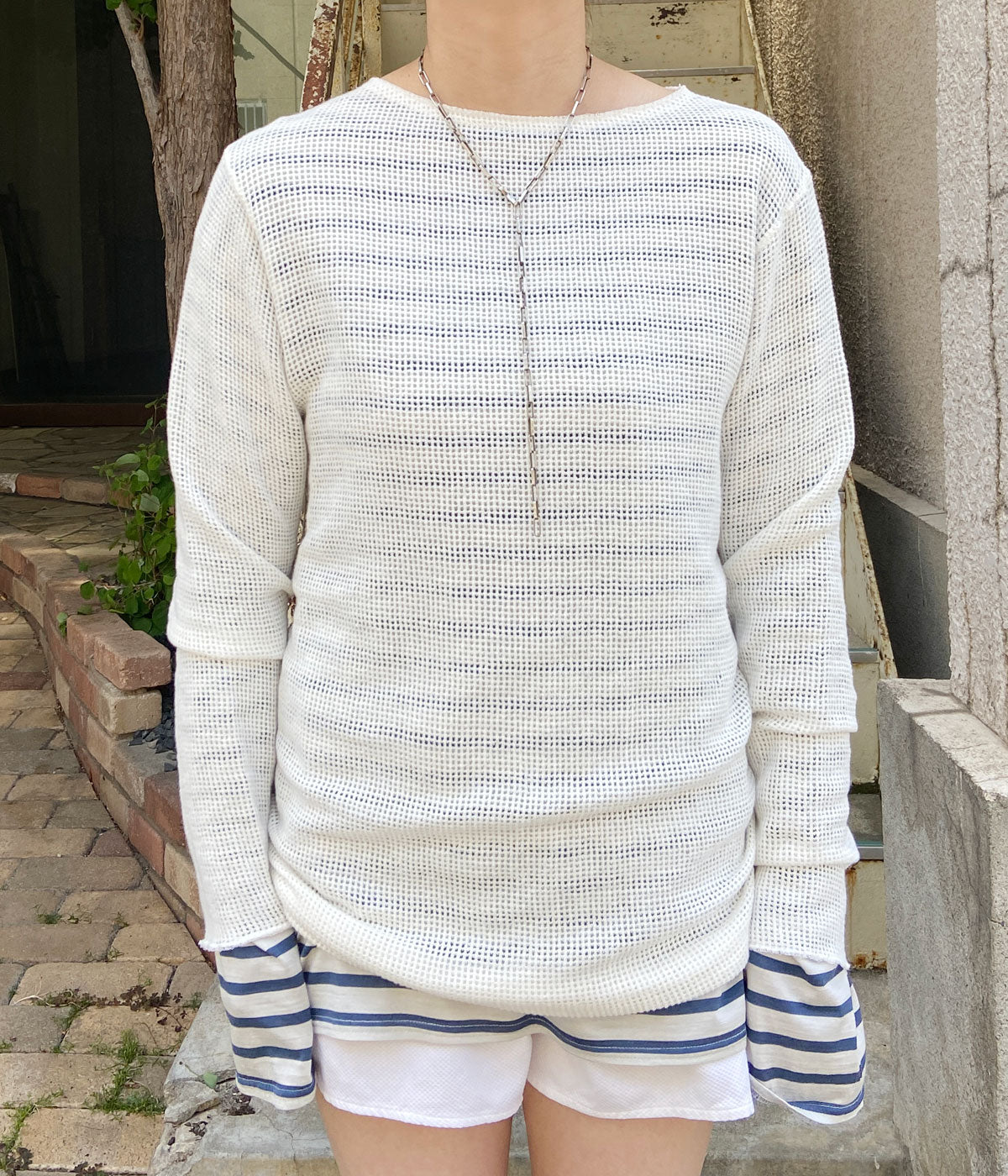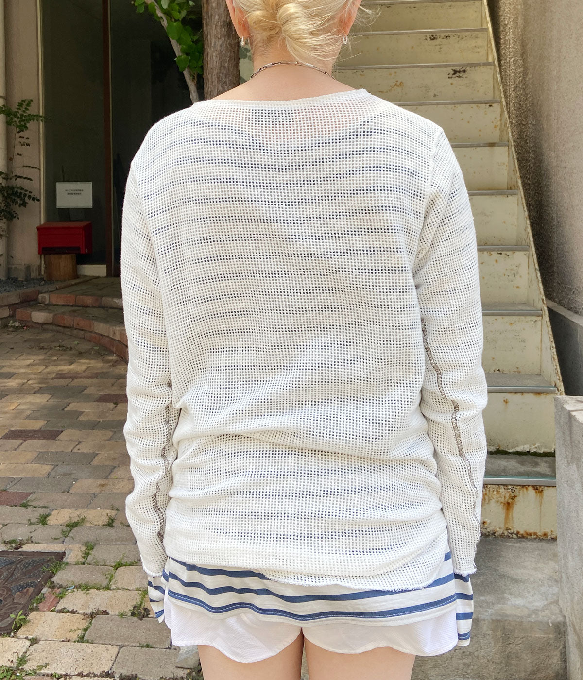 nowosからMESH TOPが入荷しました。サイド、袖に施したカーキ糸のラインが目を惹くメッシュトップス。長めにとった着丈と緩めの首元で大人の可愛さが詰まった一枚に。主役として着ても良し、インナーとして着ても良し、出番の多い一枚になること間違いなしです。