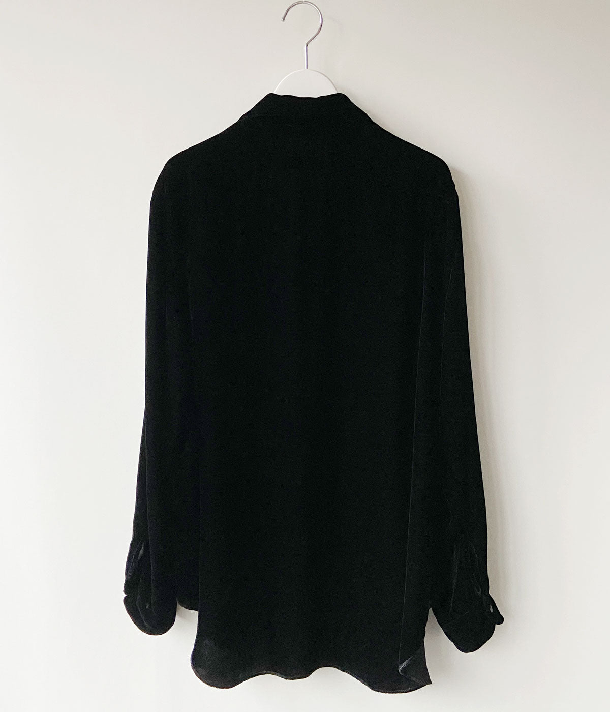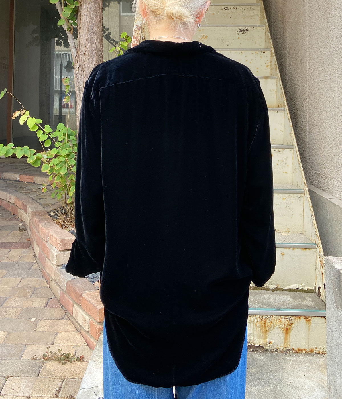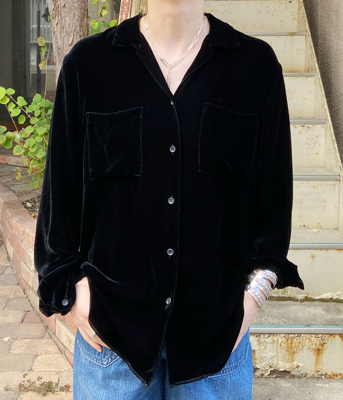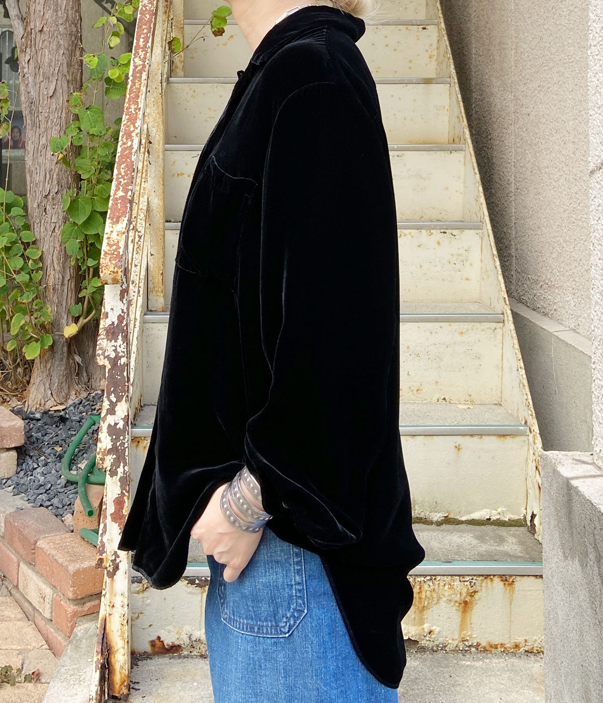 nowosからVELOUR SHIRTが入荷しました。滑らかな肌触りのベロアシャツ。ゆったりとしたサイズのカジュアルなシルエットに、黒々としたベロアの美しい光沢の対比が面白い。カジュアルにもフォーマルにも〇。着回しの効く一枚です。