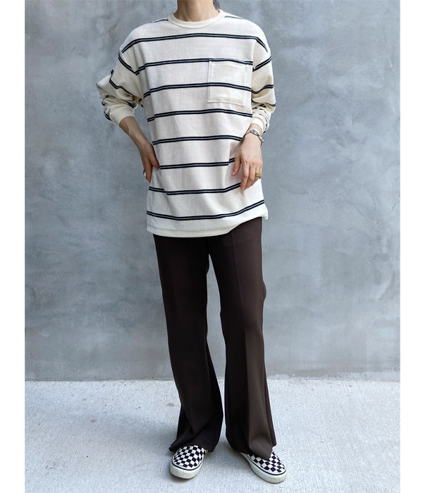 PHEENYからAMUNZEN FLAREDPANTSが入荷しました。フレアシルエットにセンタークリースを入れ、縦ラインを強調し脚を綺麗に見せるパンツ。生地に伸縮性がありリラックスした履き心地ですが、見た目は布帛のスラックスを履いているかのような仕上がり。洗濯しても型崩れしにくく、速乾性も兼ね備えた一本です。