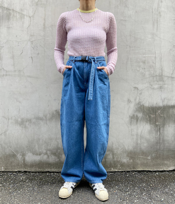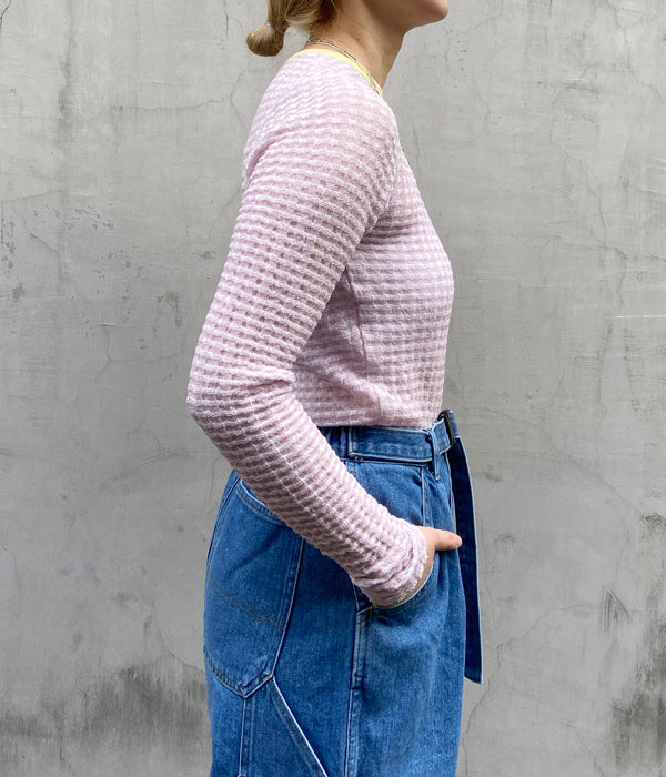 PHEENYからCHECK JACQUARD KNIT L/Sが入荷しました。ペールトーンとシアーな素材感で春らしさを取り入れたニット。特性の違う2種の糸を袋ジャガードでギンガムチェック柄に編み上げています。凹凸感があり、程よい透け感と素材の清涼感が爽やかな印象。暑い夏でも快適に着用出来ます。