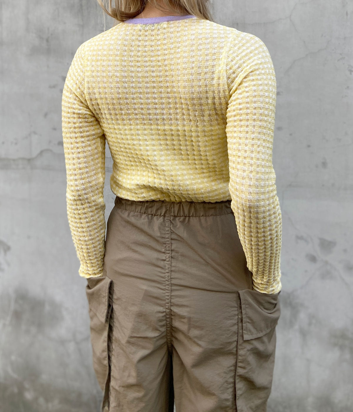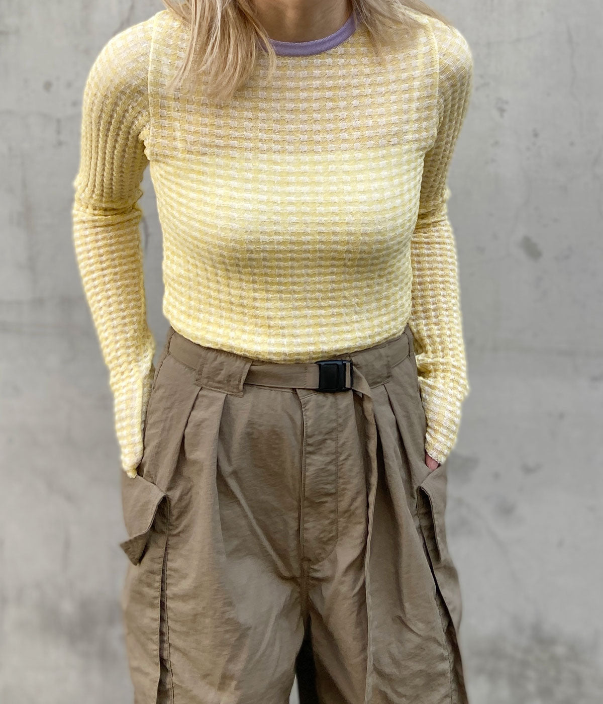 PHEENYからCHECK JACQUARD KNIT L/Sが入荷しました。ペールトーンとシアーな素材感で春らしさを取り入れたニット。特性の違う2種の糸を袋ジャガードでギンガムチェック柄に編み上げています。凹凸感があり、程よい透け感と素材の清涼感が爽やかな印象。暑い夏でも快適に着用出来ます。