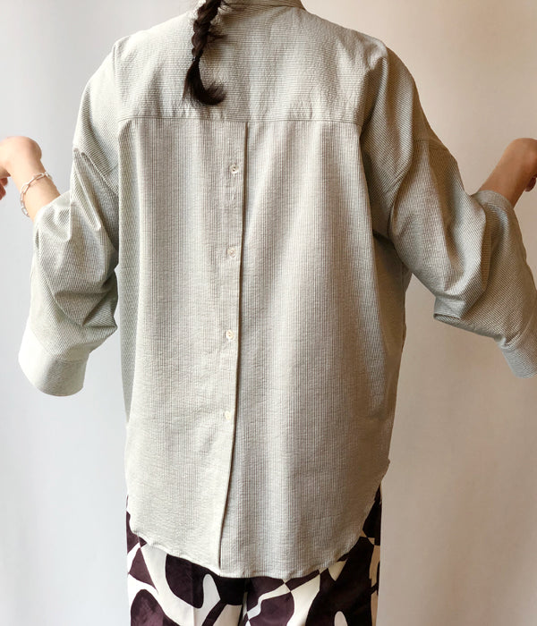 PHEENYからCOTTON LINEN STRIPE SHIRTが入荷しました。麻混の糸をジャガード編み機で編み、後染めを施しストライプ柄に仕上げたオリジナル生地を使用。凸凹のある風合いで清涼感と通気性に優れていて肌ざわりも良く夏の羽織としてもおすすめ。袖下のボタンと後身頃のボタンを開けることでシルエットを変えても楽しめます。