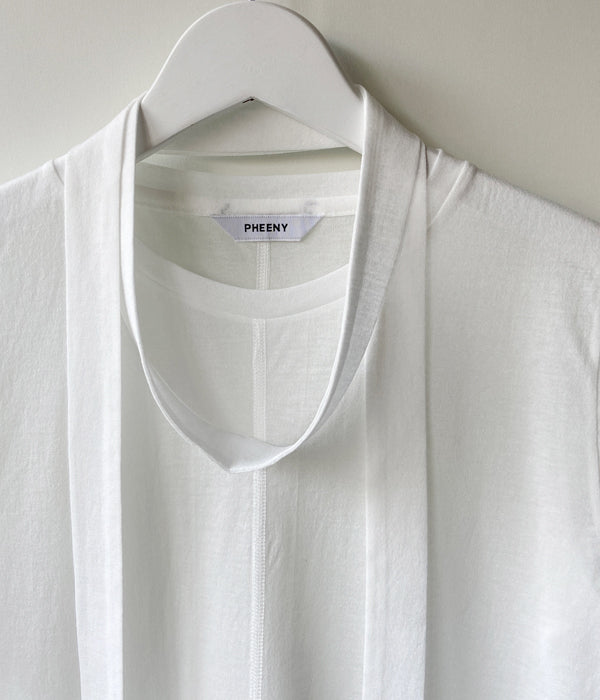 PHEENYからCOTTON NYLON SHEER L/Sが入荷しました。3年ぶりに復刻したシアー天竺のカットソー。スッキリとしたシルエットでクリーンに仕上げつつ、切替のフラットシーマーや、脇のスリットなど細部にニュアンスを加えた一枚。ボータイの巻き方で様々なアレンジが楽しめます。シャリ感があり、サラッと肌離れも良く、暑い夏でも快適に着用出来ます。