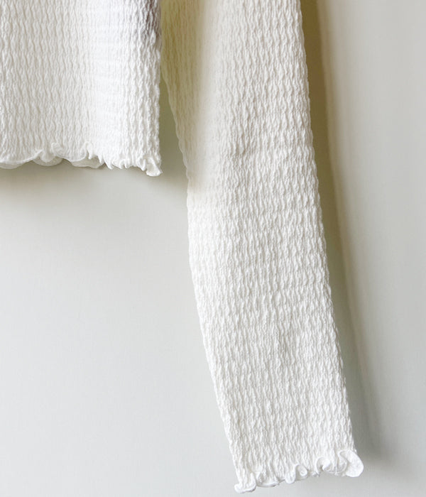 PHEENYからCOTTON SHIRRING CARDIGANが入荷しました。シャーリングを表現した凹凸感が特徴のコンパクトなカーディガン。ボタンを閉じてクルーネックトップスとしても、羽織のカーディガンとしても。裾と袖口のフリルで軽やかさをプラスしています。伸縮性に優れているため、着心地の良さも特徴です。
