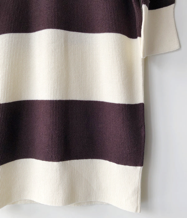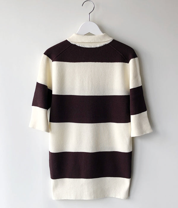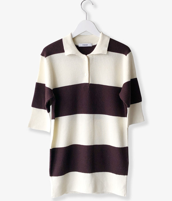 PHEENYからCOTTON WHOLEGARMENT POLO S/Sが入荷しました。ラガーシャツをニットポロに落とし込んだ1枚。上品にフィットするシルエットとボーダーのカジュアルさがいい感じにミックスされています。鹿の子組織で編むことでシワになりにくく清涼感のある編地に仕上がり。