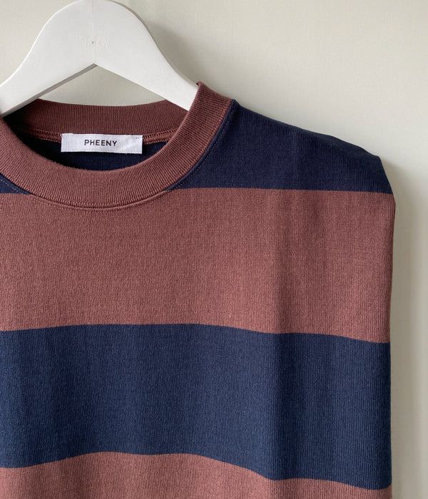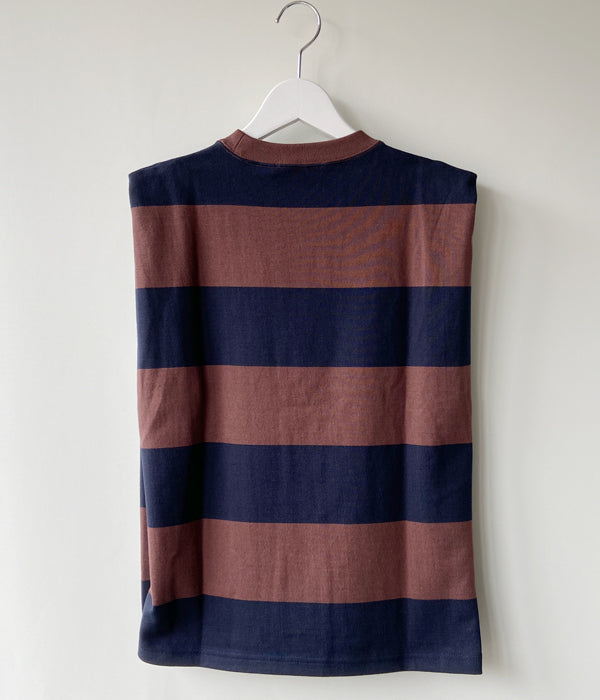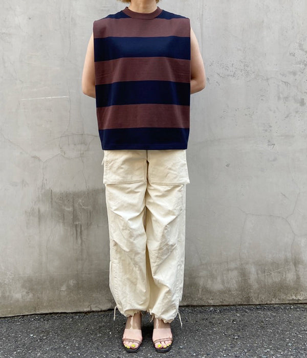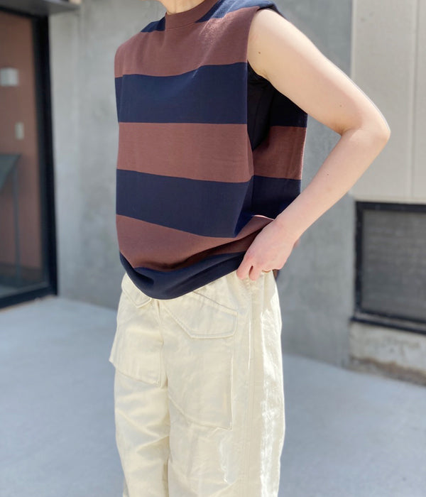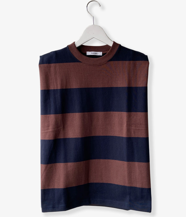 PHEENYからHEAVY WEIGHT BORDER N/Sが入荷しました。肩にタックを入れボリュームを持たせたノースリーブ。裾に向かってテーパードしたシルエットで着丈を短めに設定しているのでボトムを選ばずに着用できます。タックインするのもおすすめ。