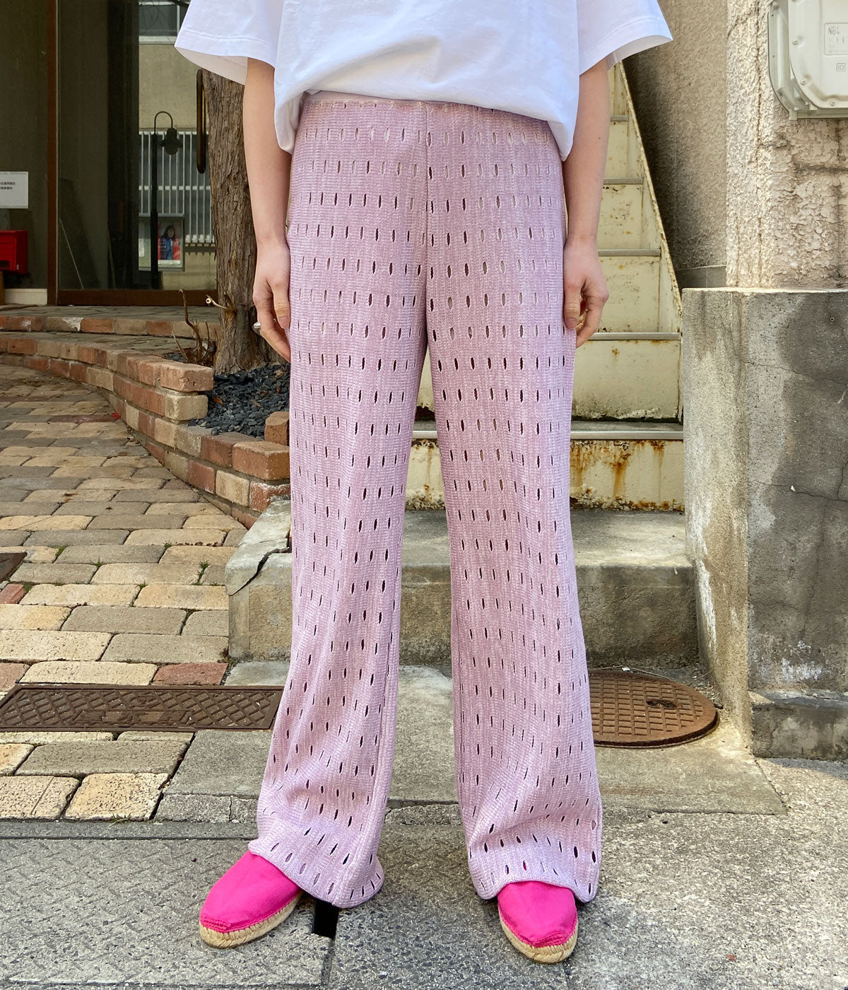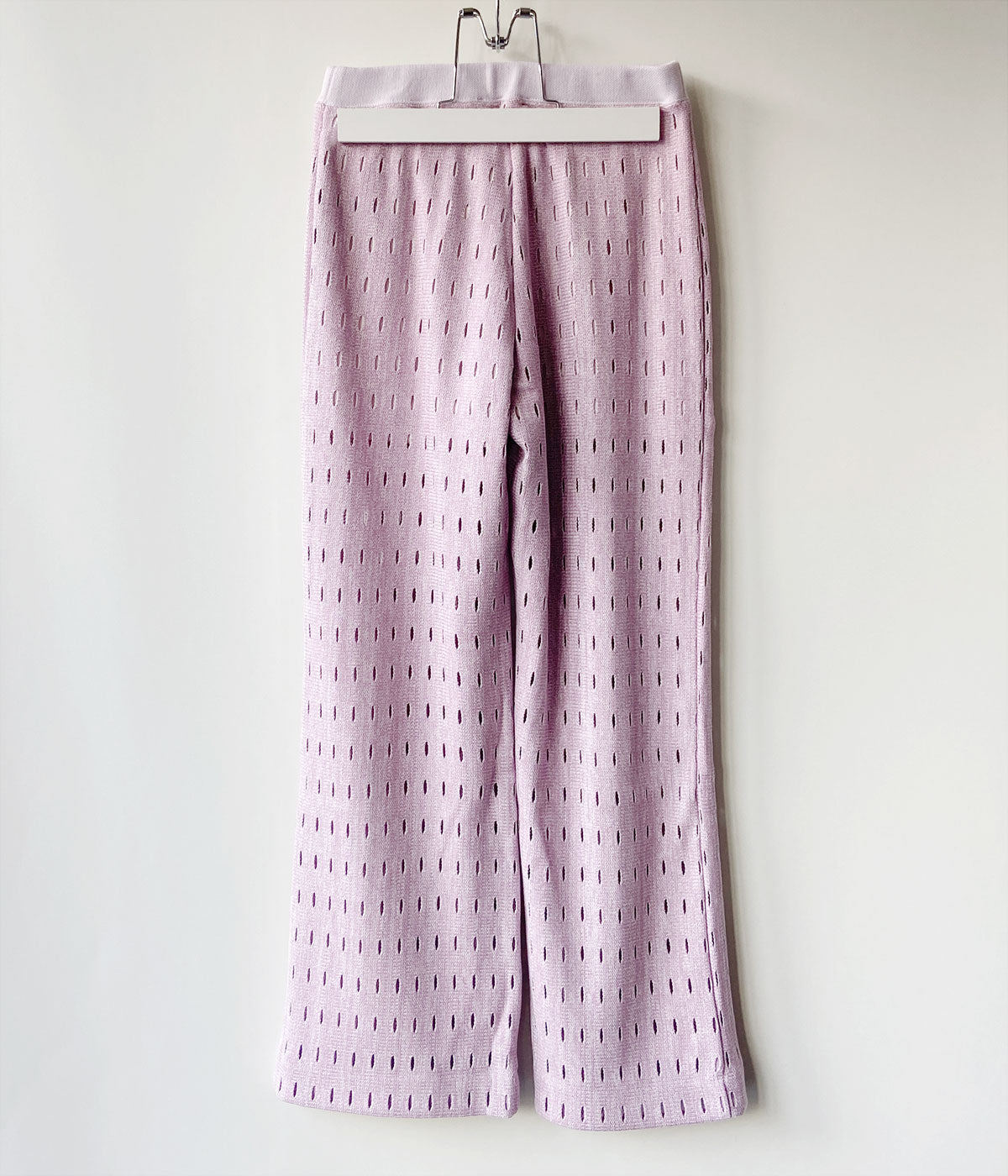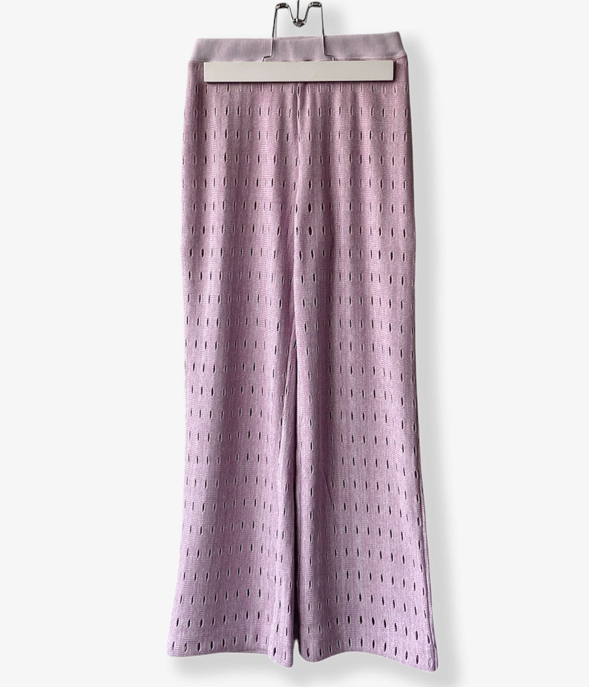 PHEENYからHOLE RUSSELL WIDE PANTSが入荷しました。日本に数台しかないローゲージのラッセル編機を使用した希少なホールラッセル生地のパンツ。ドット柄のように編まれたホールがユニークなワイドパンツに仕上がっています。ウエストはゴムでリラクシーな履き心地。エスパドリーユやサンダルに合わせて。裏地付き。