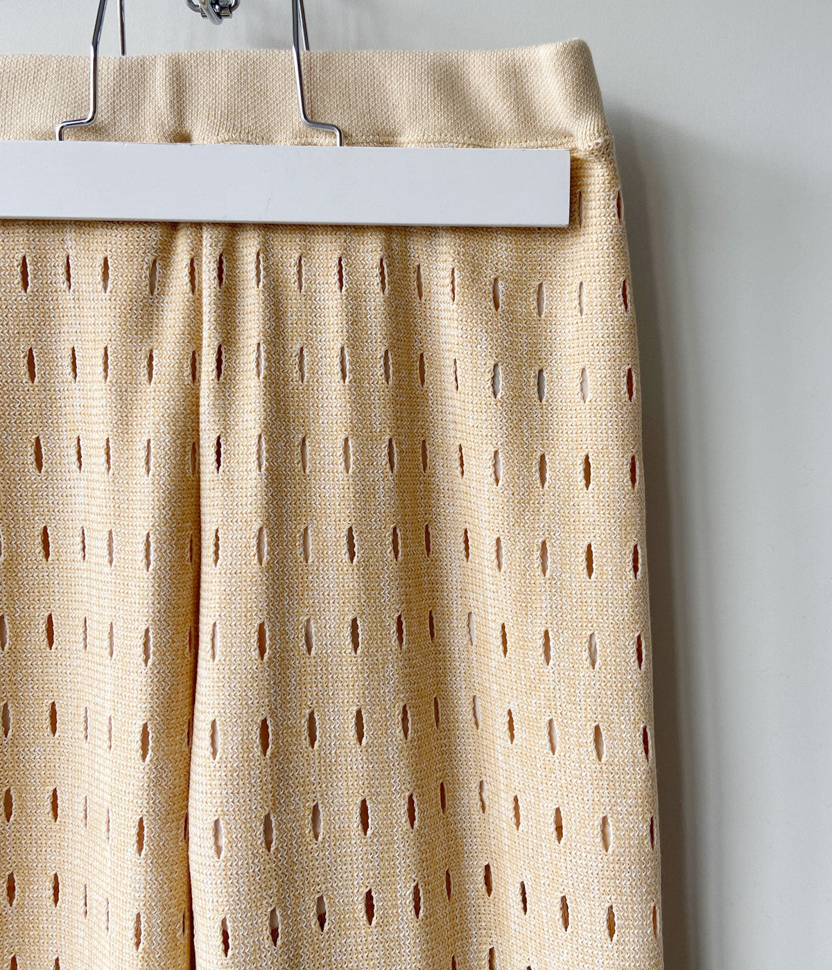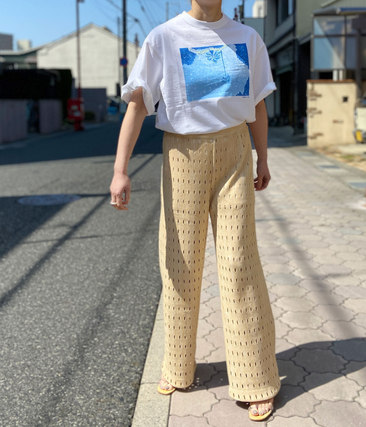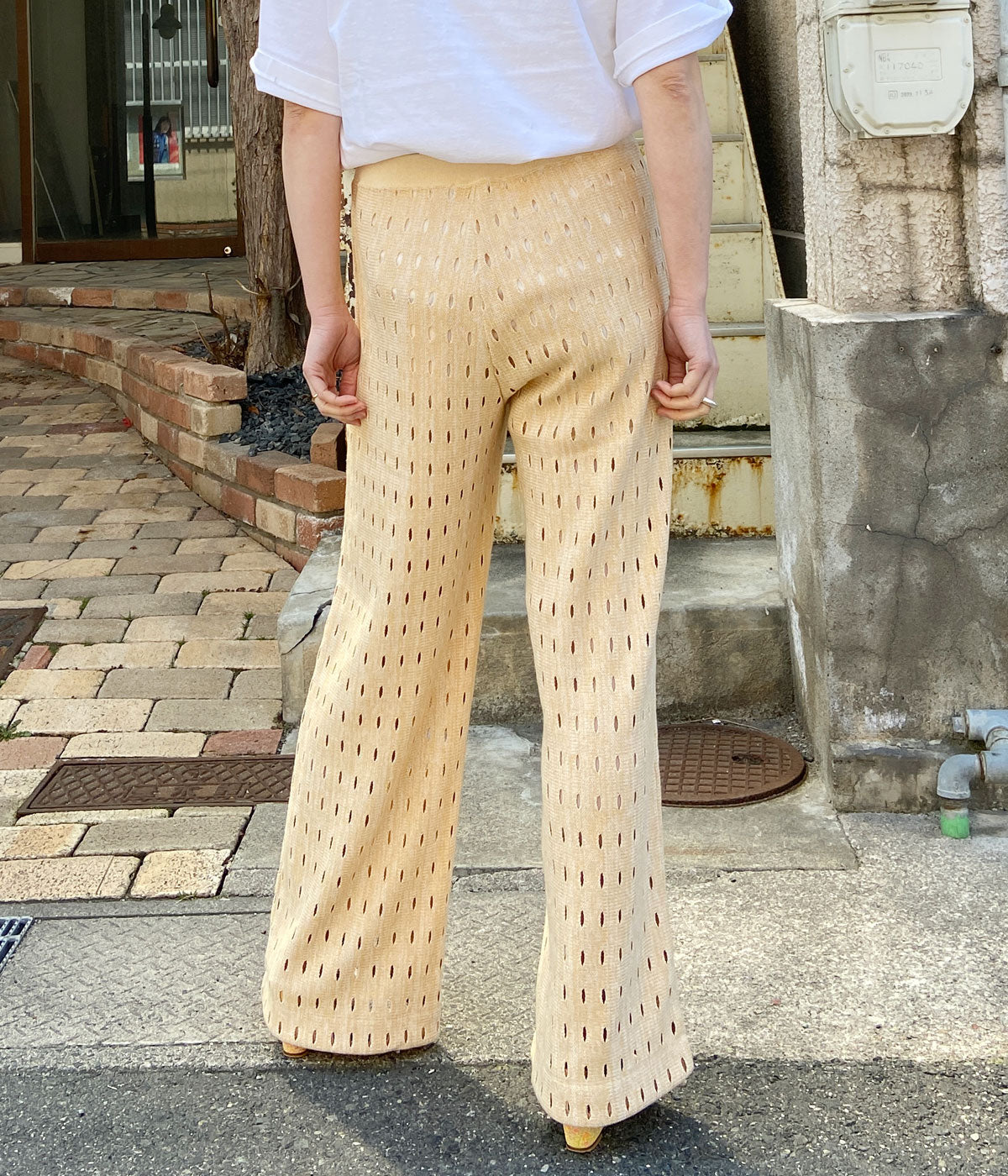 PHEENYからHOLE RUSSELL WIDE PANTSが入荷しました。日本に数台しかないローゲージのラッセル編機を使用した希少なホールラッセル生地のパンツ。ドット柄のように編まれたホールがユニークなワイドパンツに仕上がっています。ウエストはゴムでリラクシーな履き心地。エスパドリーユやサンダルに合わせて。裏地付き。