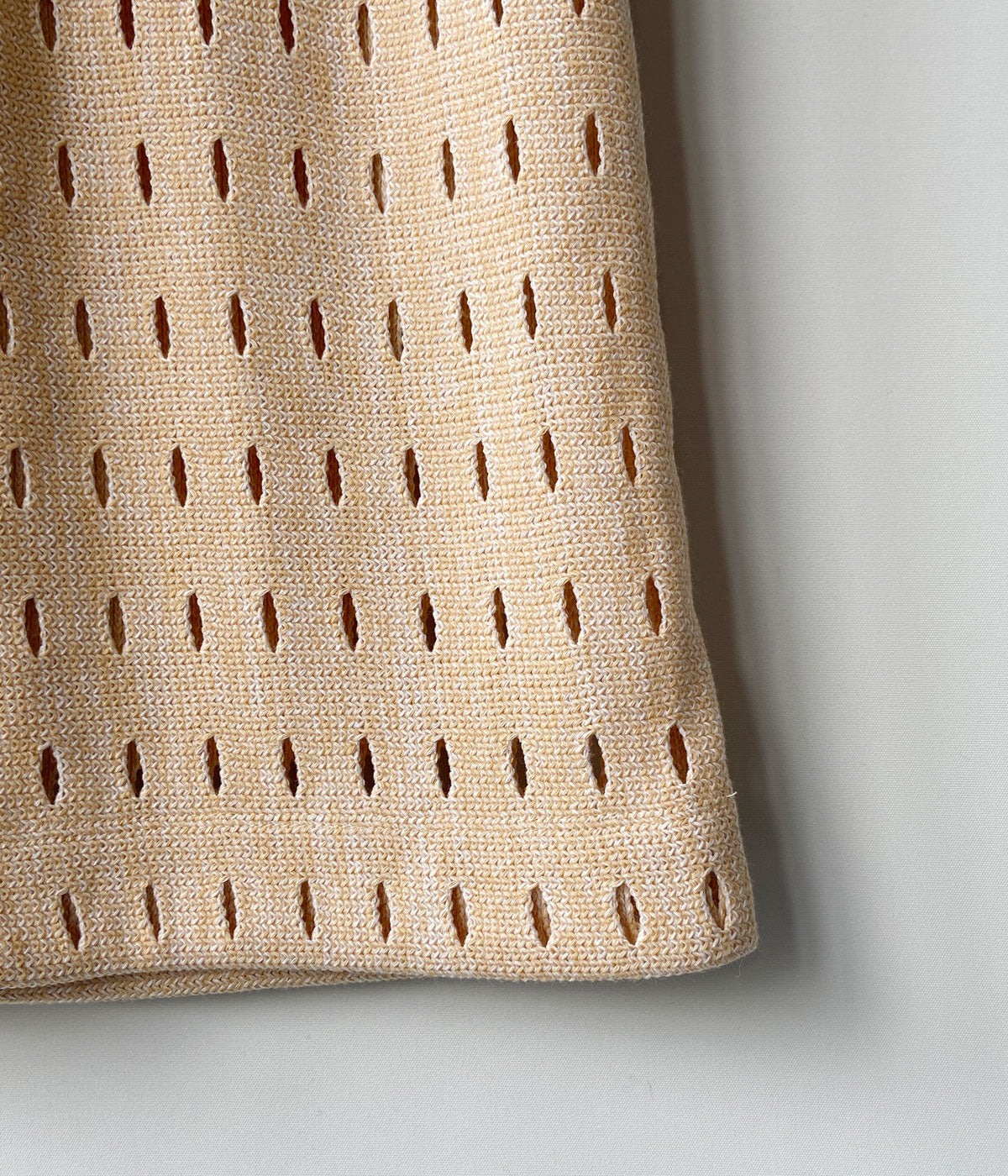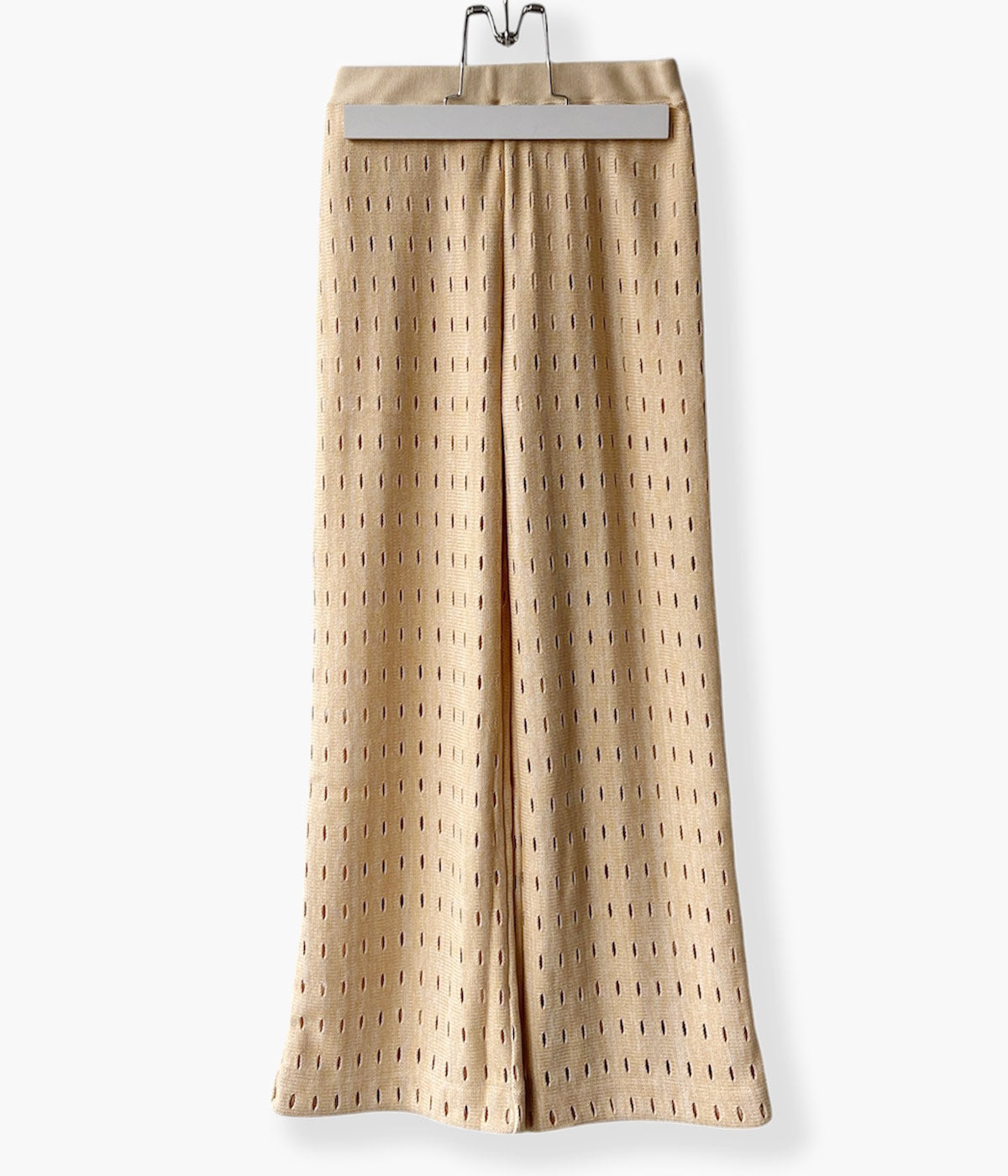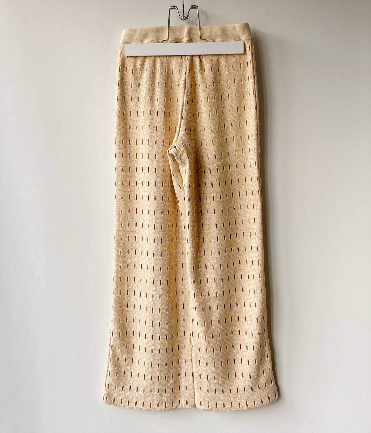 PHEENYからHOLE RUSSELL WIDE PANTSが入荷しました。日本に数台しかないローゲージのラッセル編機を使用した希少なホールラッセル生地のパンツ。ドット柄のように編まれたホールがユニークなワイドパンツに仕上がっています。ウエストはゴムでリラクシーな履き心地。エスパドリーユやサンダルに合わせて。裏地付き。
