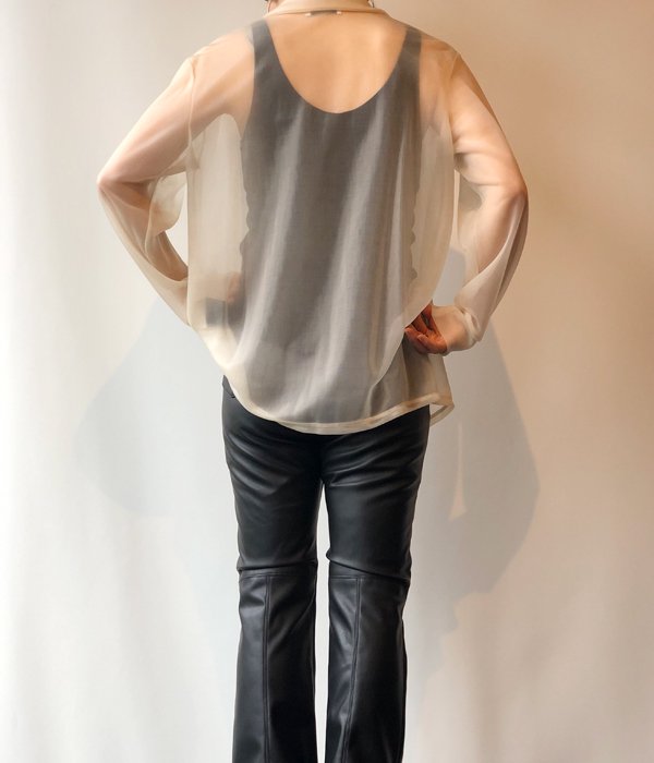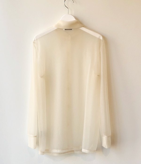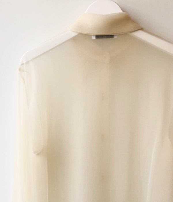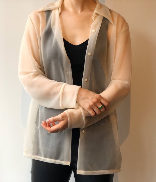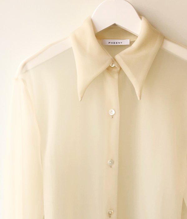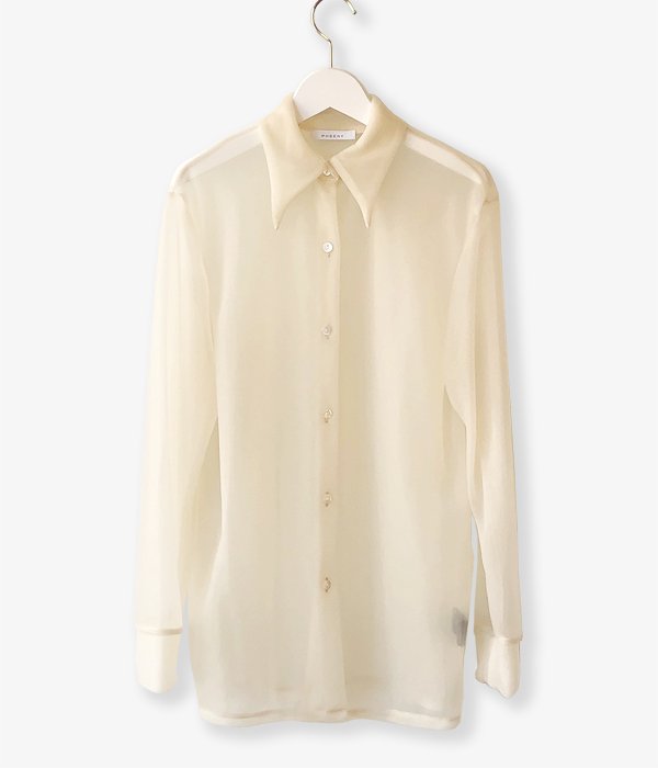PHEENYからNYLON SMOOTH SHIRTが入荷しました。70'sのようなロングポイントの衿が特徴のシャツ。モノフィラメントナイロンを使用した新感覚のスムース素材は半透明で生地の厚さがありドレープ性にも優れています。透け感が新鮮でモードな雰囲気の着こなしが楽しめます。