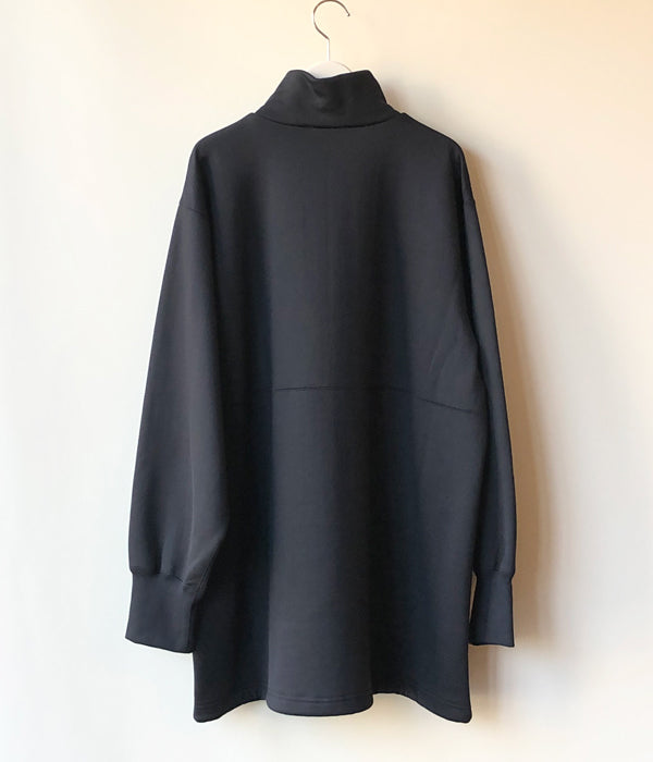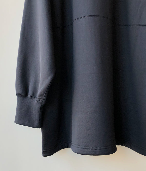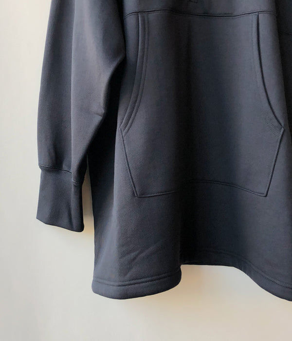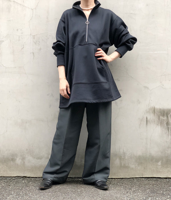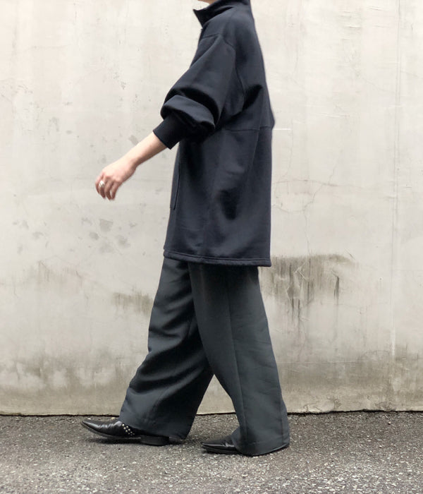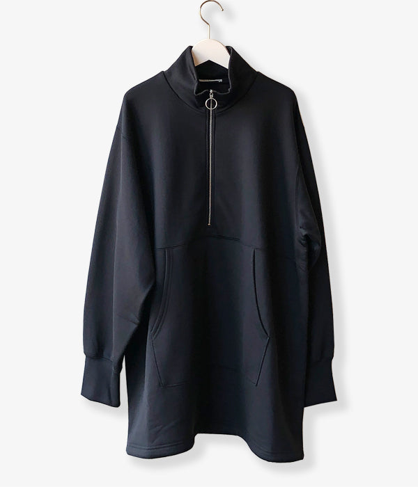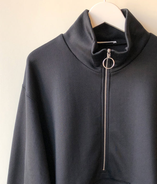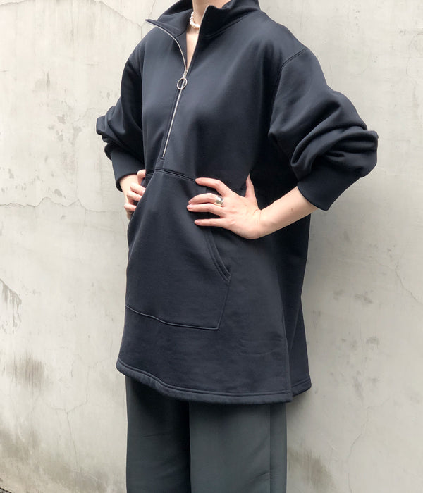 PHEENYからNYLON SWEAT HALF ZIP P/Oが入荷しました。滑らかで光沢のあるオリジナルの裏毛を使用のハイネックプルオーバー。速乾性がありシワになりにくく丈夫な表面と肌に触れる裏面には綿を使い肌触りの良さも兼ね備えています。アウター感覚で着用できるゆったりボリュームのあるシルエットでメンズも着られるサイズ感。裾のスピンドルを絞ることでシルエットの調整も可能です。