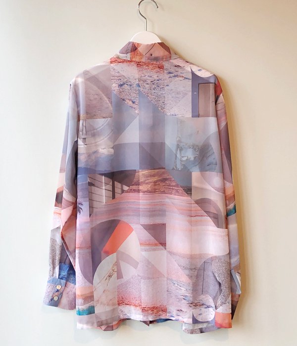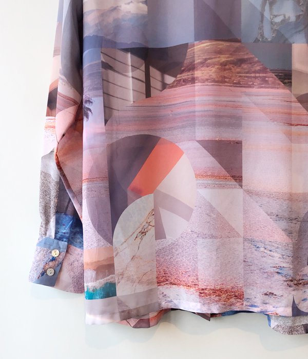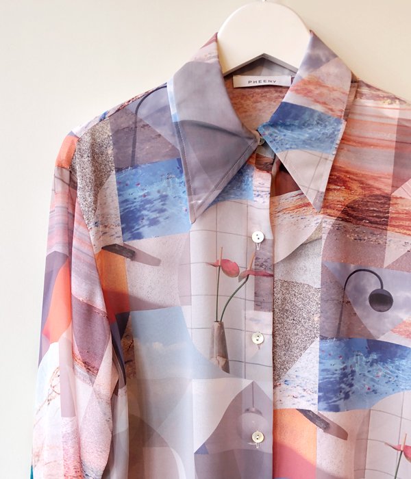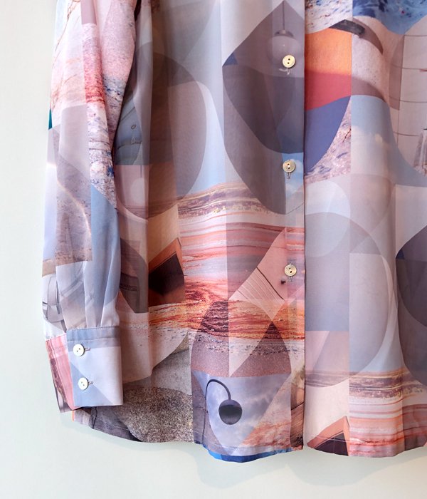 PHEENYからPRINT CHIFFON SHIRTが入荷しました。しなやかな肌触りとキレイな落ち感が特徴の生地に、直線と曲線のコンポジションが特徴的なオリジナルグラフィックがプリントされています。着心地が軽くさらりとした風合いでシワになりにくく、ウォッシャブルでケアが簡単なのもポイントです。