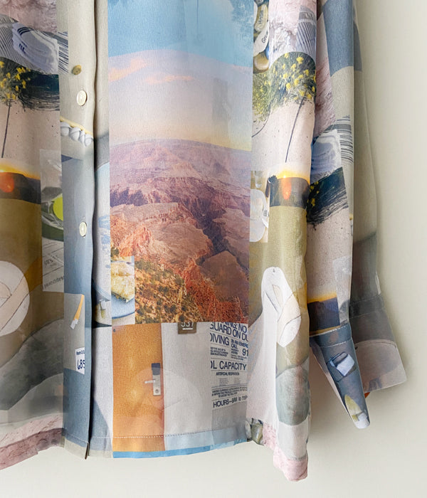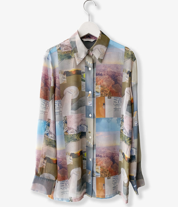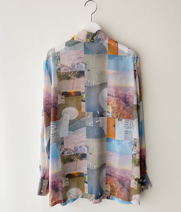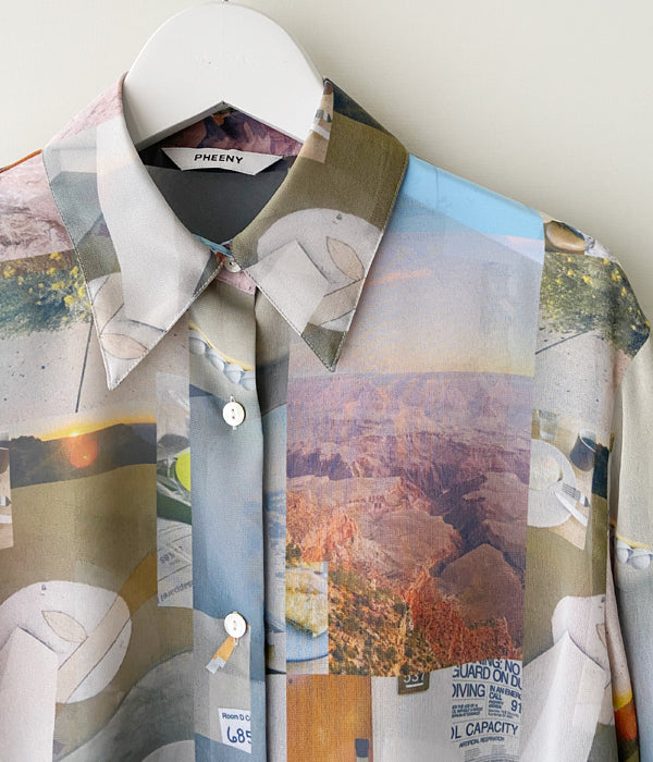 PHEENYからPRINT CHIFFON SHIRTが入荷しました。デザイナーがアメリカ旅行中に撮影した写真をコラージュして、シフォンジョーゼットにプリントしたシャツ。シアー感を生かして一枚で着用したり、インナーにタートルネックを合わせたり、シーズン問わずに活躍する一枚です。今シーズンを象徴する生地。