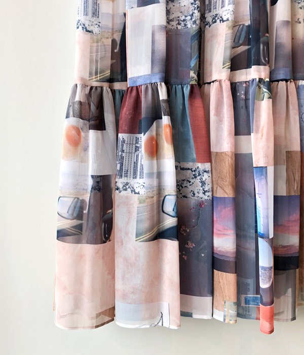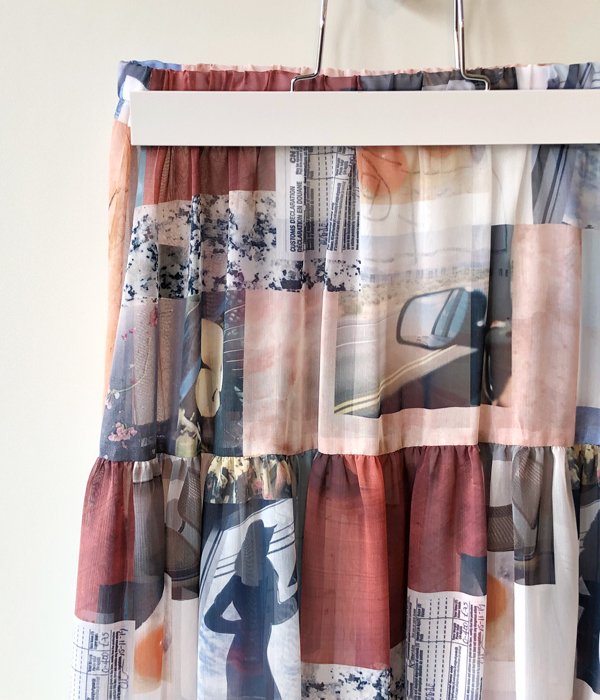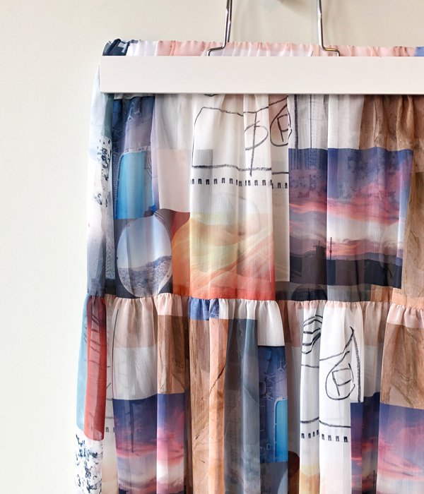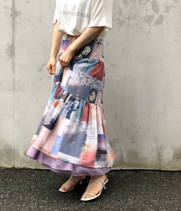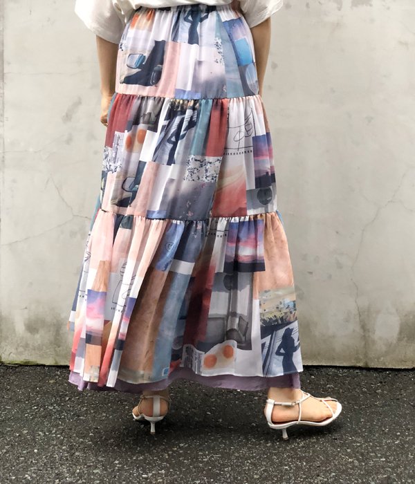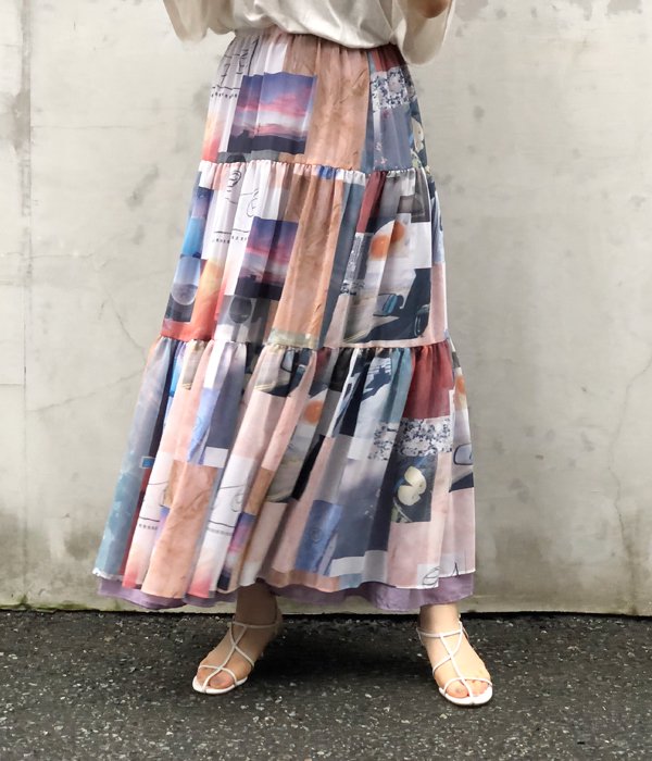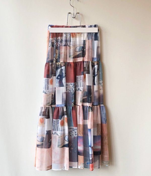 PHEENYからPRINT CHIFFON TIERED SKIRT(MULTI)が入荷しました。デザイナーが旅先で撮影した写真や日常の風景などをコラージュした総柄プリントのオリジナル生地を使用のティアードスカート。透け感が美しく新鮮でコーディネートの主役となる一着。Tシャツやボリュームのあるローゲージニット等と合わせてカジュアルダウンしたスタイリングがおすすめです。