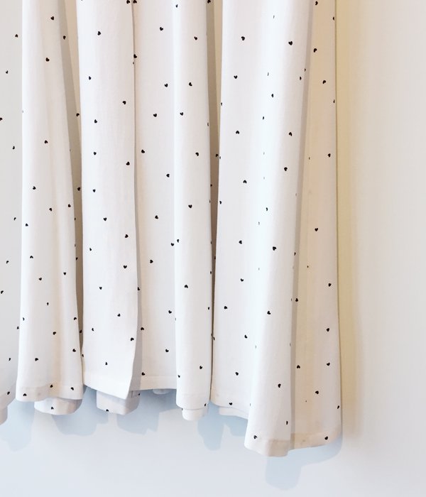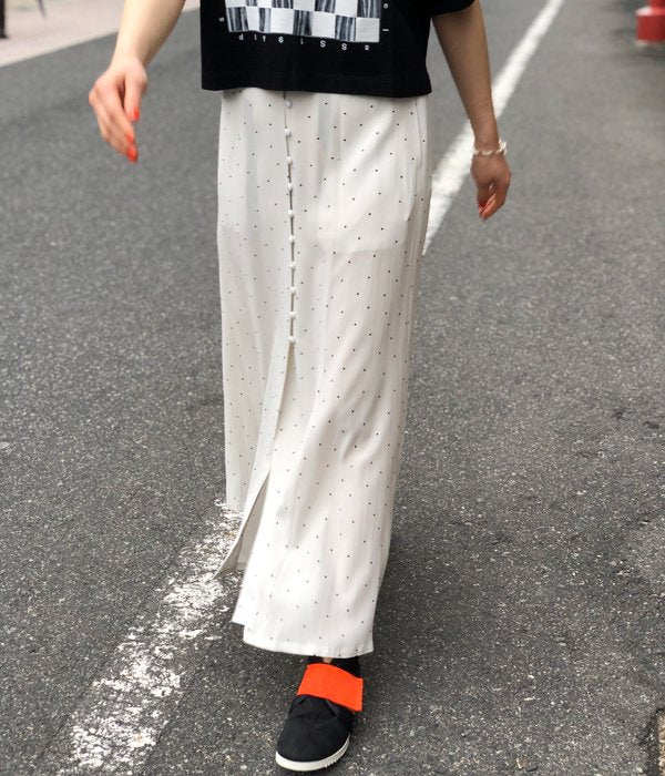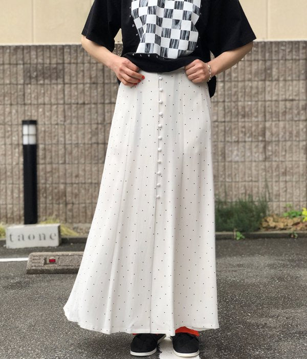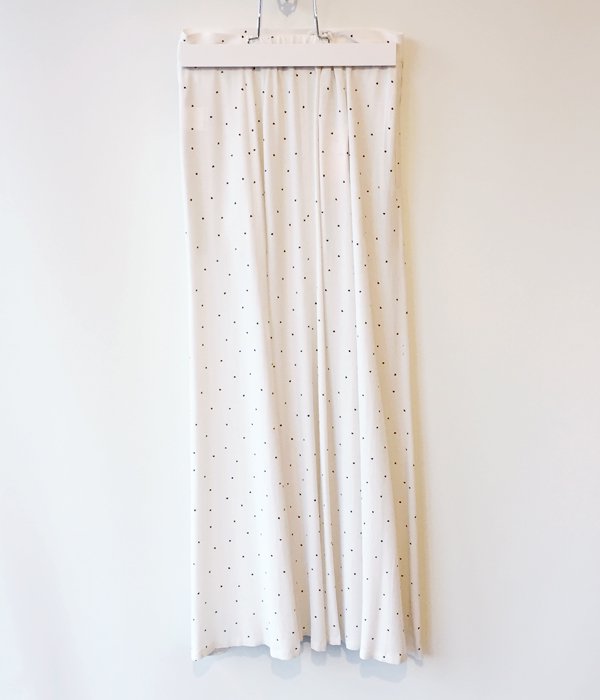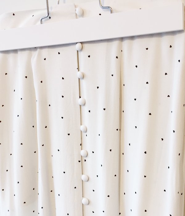 PHEENY定番オリジナルプリントシリーズのロングスカート。ドット柄は良く見ると小さなハート型。生地表面の凸凹感、レーヨンのドレープが特長です。フロントに深めに入ったスリット、70年代の古着のような足つきのボタンもポイント。単品使いはもちろん、同素材のシャツとセットアップでの着用もおすすめです。