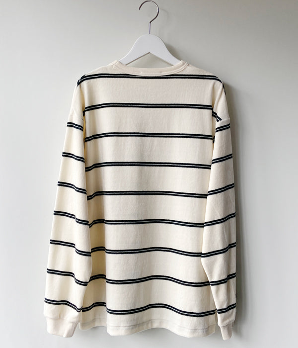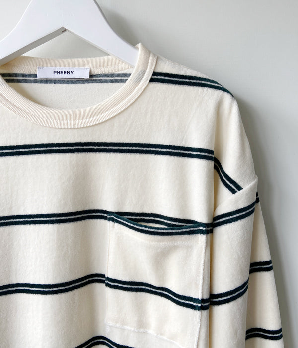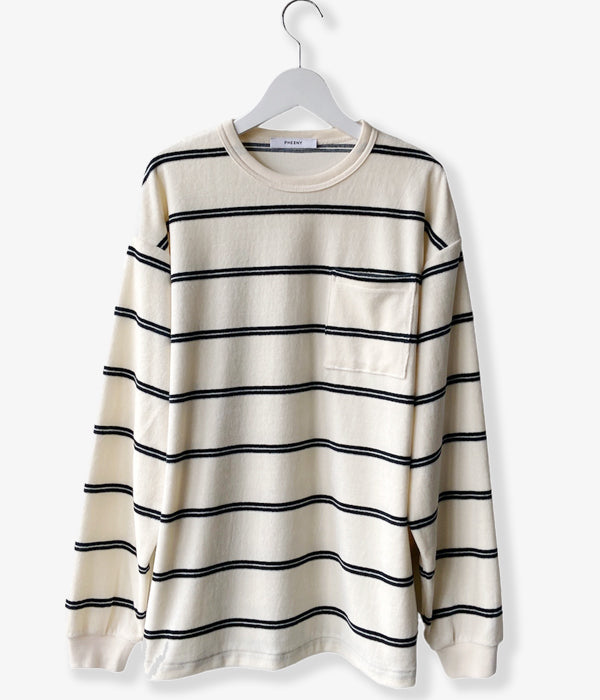 PHEENYからVELOURS BORDER L/S(が入荷しました。古着屋に並ぶベロアのカットソーをイメージして作った、ゆるっとリラックスしたシルエットのベロアロンT。太ピッチのボーダー柄が懐かしい雰囲気です。素材とカラーで気軽に季節感を取り入れられる一枚。洗濯しても型崩れしにくく、速乾性も兼ね備えています。