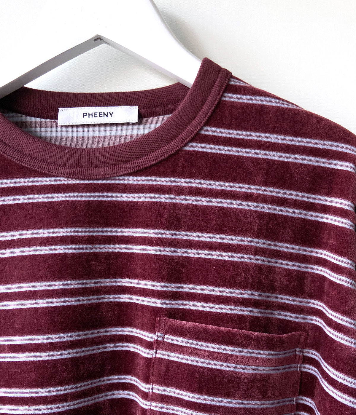 PHEENYからVELVET BORDER L/Sが入荷しました。リラックス感のあるボクシーなシルエットのロンT。シンプルなデザインでデイリースタイルにぴったりです。パイル部分にはコットンを使用し膨らみ感があり、裏面はポリエステルを使用して洗濯後の型崩れを防ぎ、速乾性も兼ね備えた一着です。