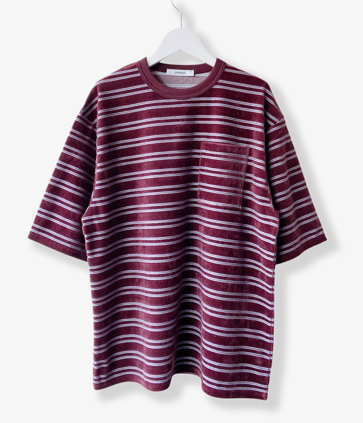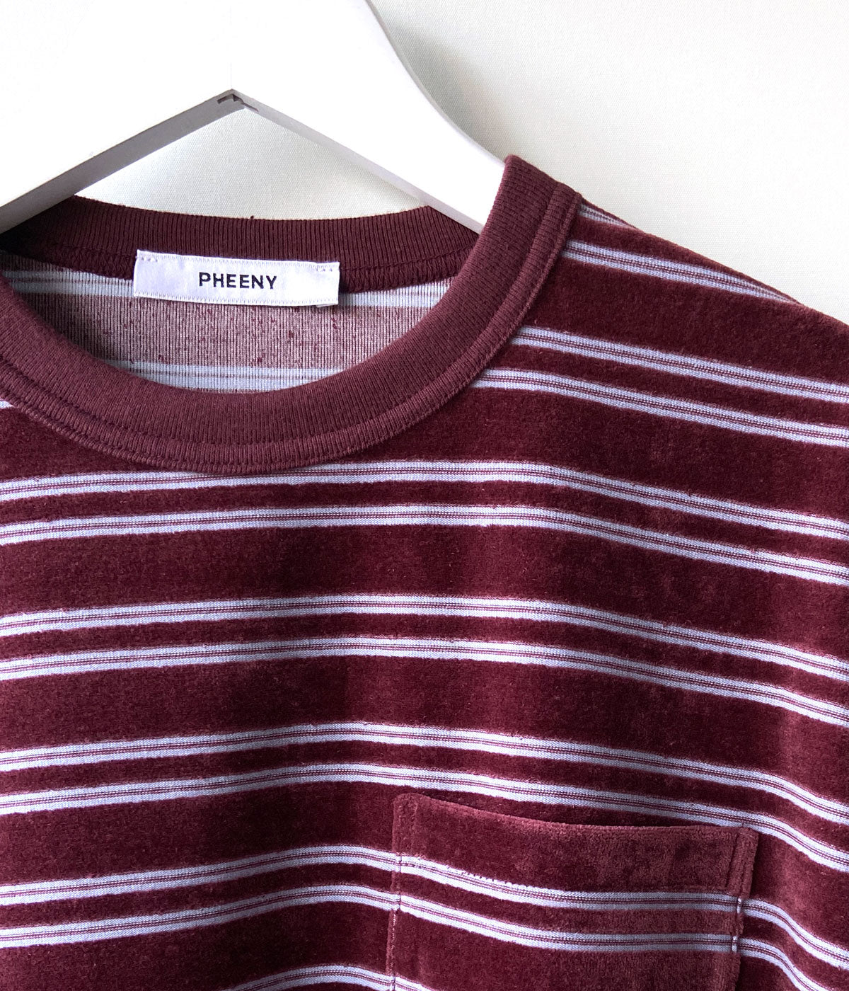 PHEENYからVELVET BORDER S/Sが入荷しました。リラックス感のあるボクシーなシルエットのTシャツ。シンプルなデザインでデイリースタイルにぴったりです。パイル部分にはコットンを使用し膨らみ感があり、裏面はポリエステルを使用して洗濯後の型崩れを防ぎ、速乾性も兼ね備えた一着です。
