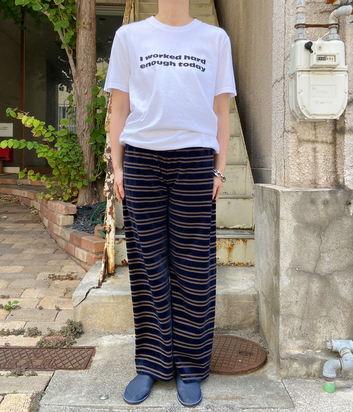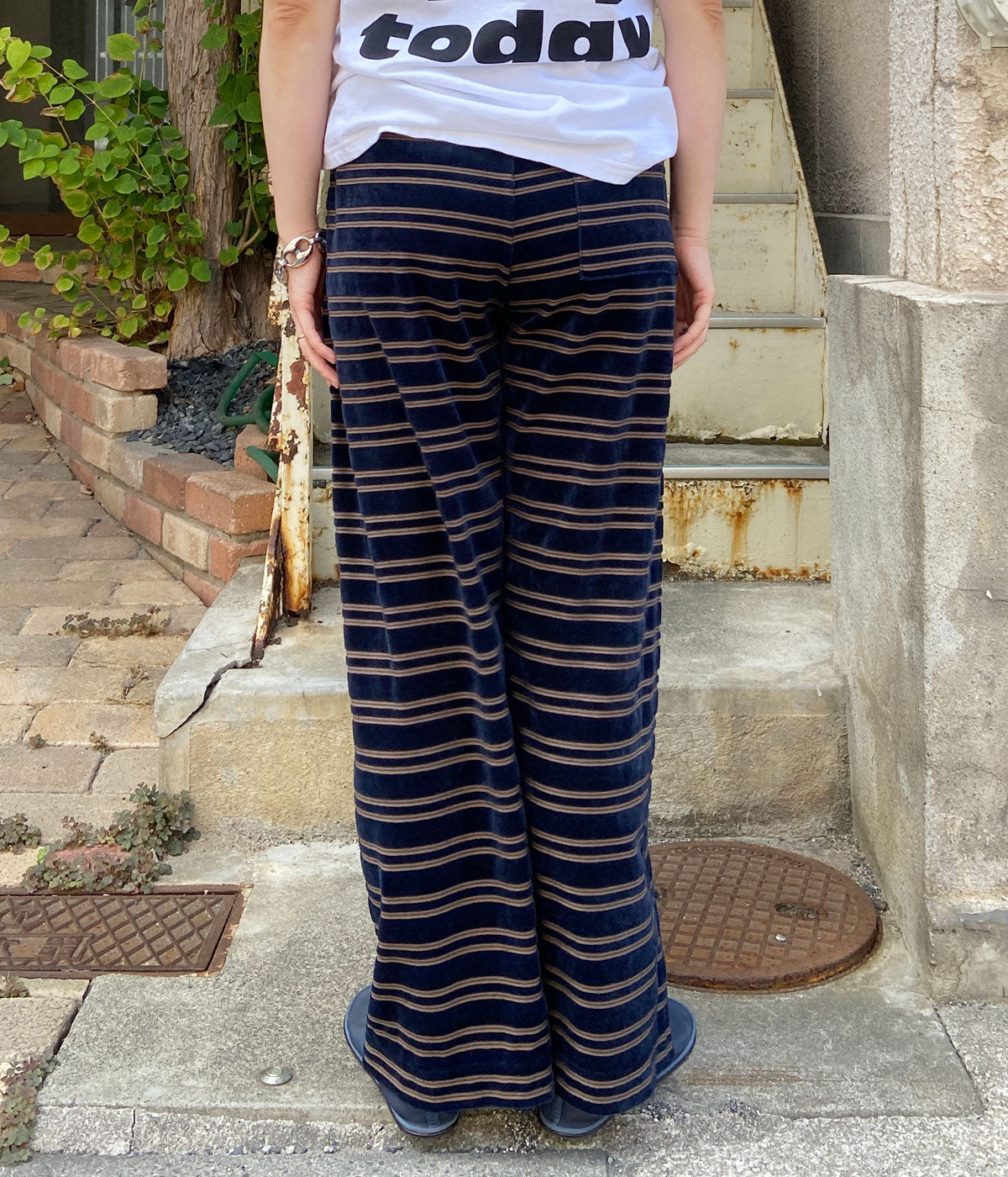 PHEENYからVELVET BORDER WIDE PANTSが入荷しました。ワイドストレートシルエットのパンツ。ウエストはゴム仕様で、内側にドローストリングを配置し、リラックスした履き心地。脇にはシームポケット、右後ろにポケット付き。コーディネートの主役になるアイテムです。