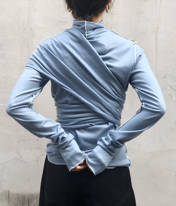 PHEENYからWOOL ENSEMBLE L/Sが入荷しました。タイトなシルエットでクリーンにシンプルに仕上げつつ、縫い目のロック糸を表に出し遊びを加えたトップス。長さたっぷりの袖をブラウジングしたりシャツ等とレイヤードして覗かせても。レイヤードしたパーツはベストのように巻き付けたり、単体で他のITEMに重ねたり。またWOOLの暖かさを活かしてスヌードとして使うのもおすすめです。