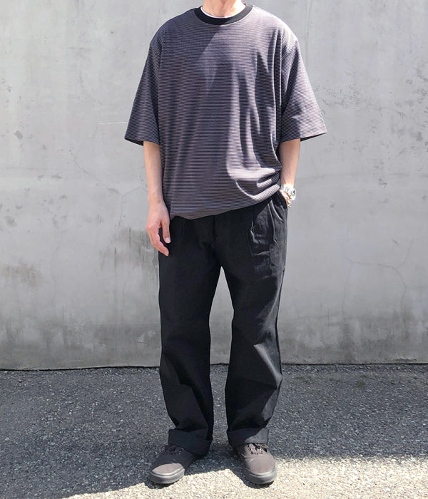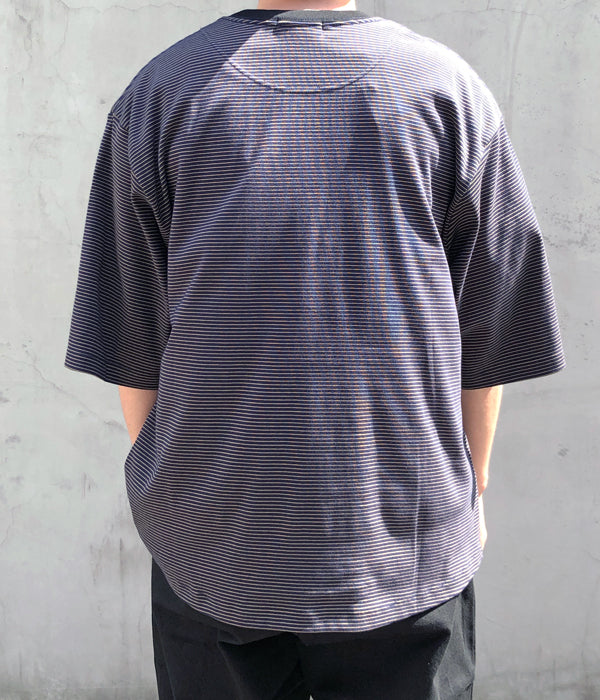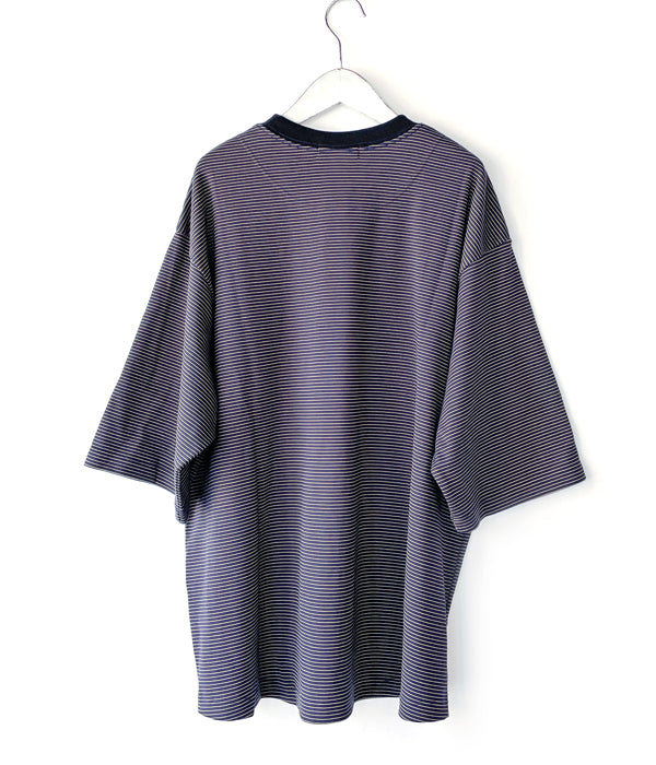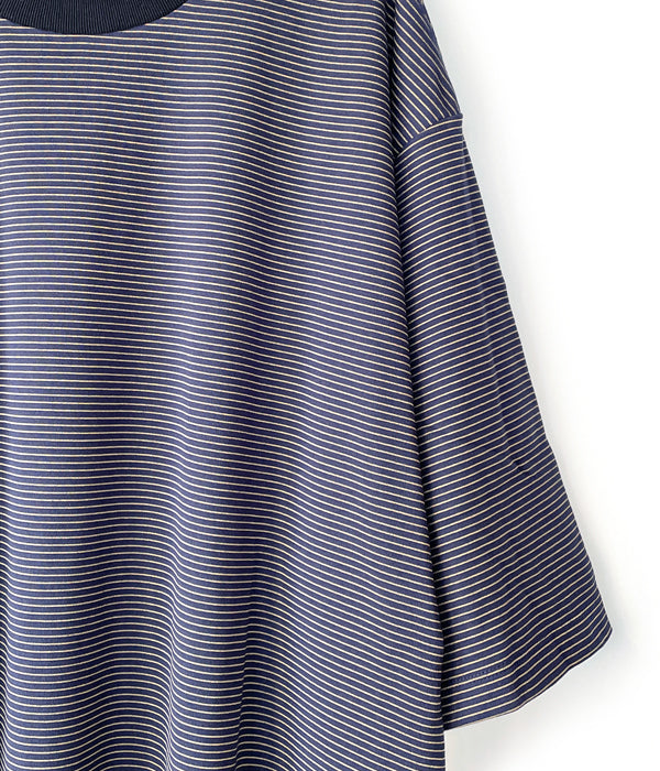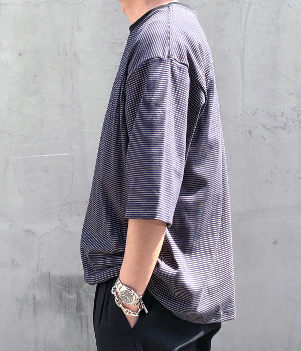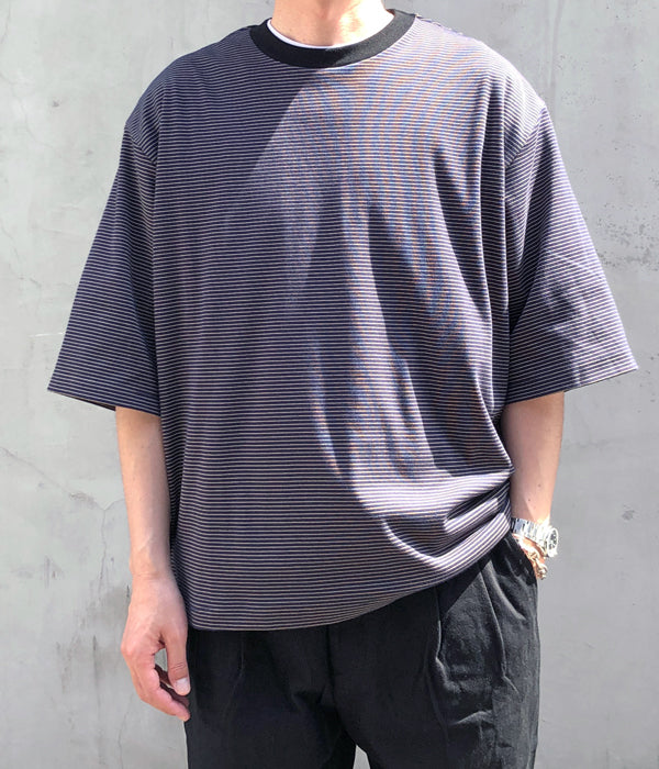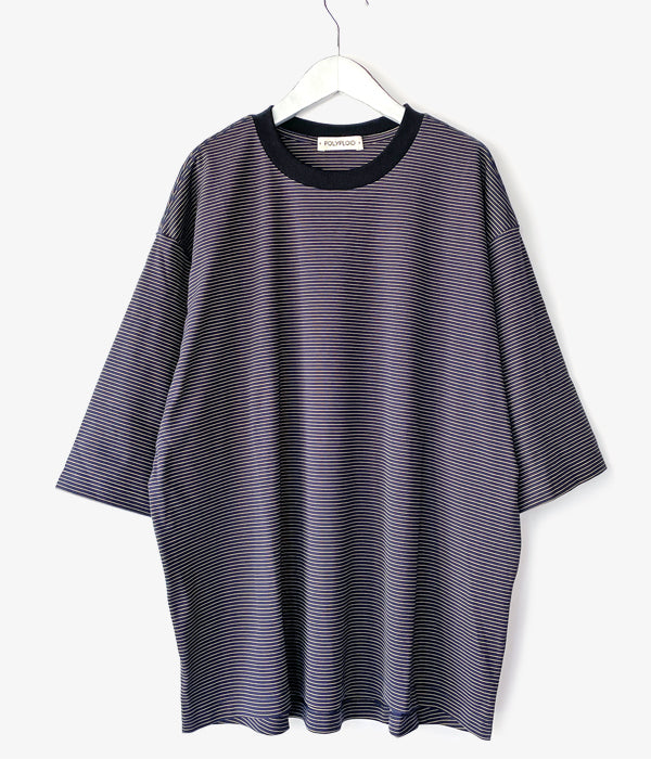 POLYPLOIDから、T SHIRT Bが入荷しました。ポリミックス素材を用いた流れるようなドレープ感が美しいSS T-SHIRT。細いピッチのボーダー柄が通好みな渋い印象を与え、前後異なる丈感が動きのあるシルエットを作り出し、長めのハーフスリーブにゆったりとしたサイジングに仕立てた存在感のある1着。