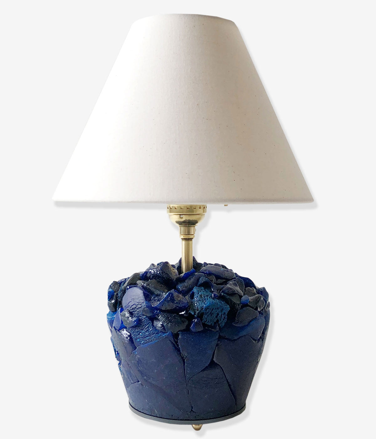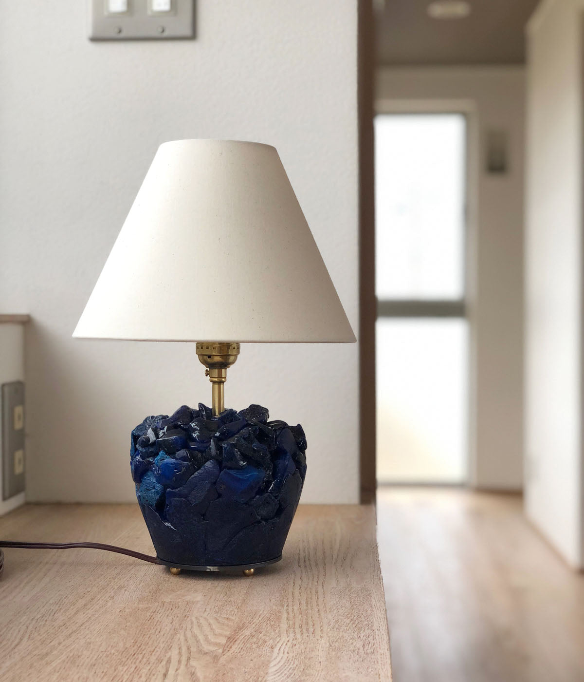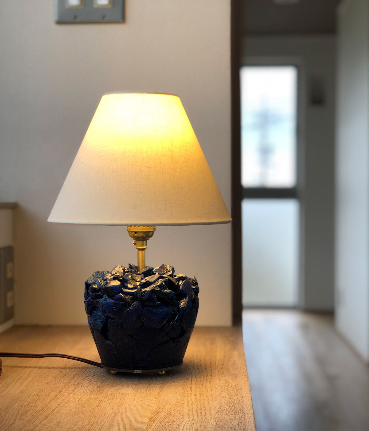 R.ALAGANからENGRAVED BLUE LAMPが入荷しました。ガラス造形作家の神代良明さんとのコラボレート商品。⽇々の暮らしに寄り添うというコンセプトのもと、アートピースと実⽤品の交差点を模索。ガラスで繊細に表現された⾊、質感、形状はまるで地層のような積層体の重厚さと表⾯の艶やかさが美しいものに仕上がっています。ランプシェードは、⽇本製のコットン素材を使用し、アイボリーカラーが、ディープブルーガラスと美しいコントラストを⽣み出しています。