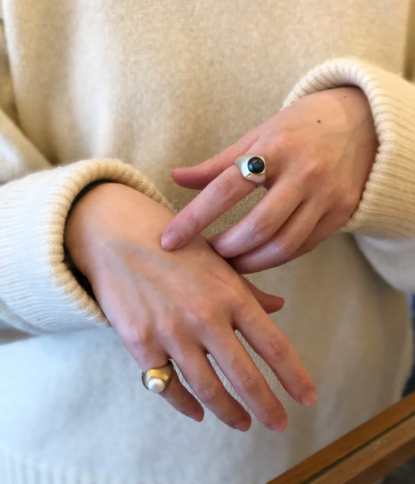 R.ALAGANからLAMP PEARL RINGが入荷しました。台湾の天燈をイメージしたリング。火の力と空気で膨らんだ天燈をスクエアと丸みで、エッグ型の淡水パールで光の艶をユニークに表現。ボリュームタイプのリングをピンキーとして着けるのもおすすめです。