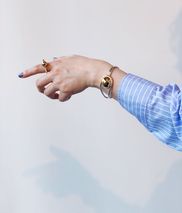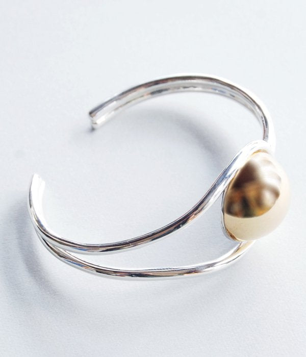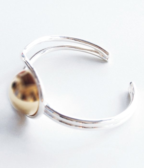 イームズハウスの天井に飾られているライトをモチーフにしたシリーズのブレスレット。腕に沿うような滑らかな曲線が美しい。ニットやシャツに重ねての装着がおすすめ。