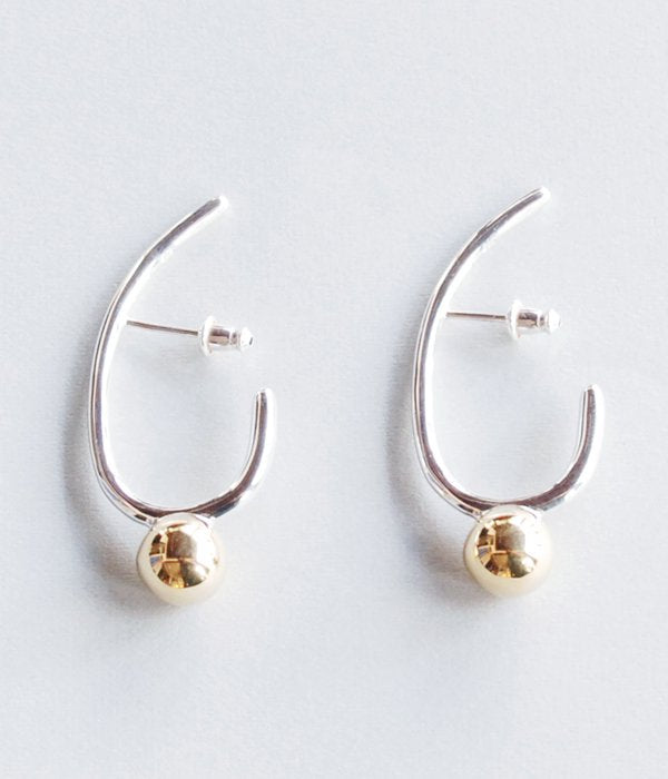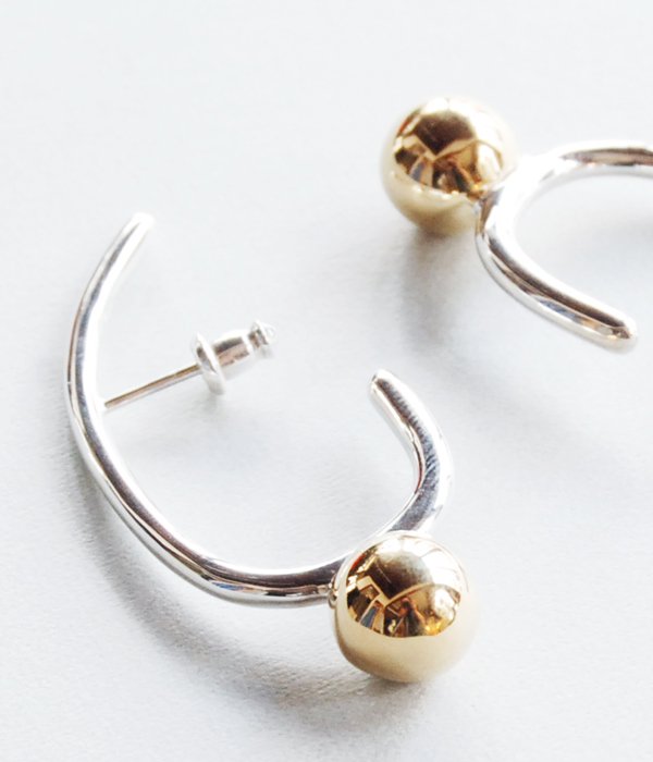 イームズハウスの天井に飾られているライトをモチーフにしたピアス。耳の骨に引っ掛けてつけるデザイン。明かりを灯すように、ライトを耳元で揺らして。