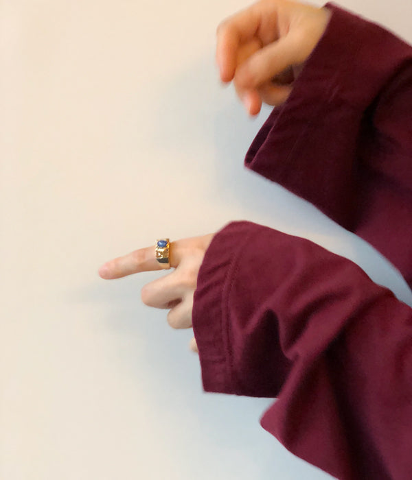 R.ALAGANからOVAL STONE SIGNET RINGが入荷しました。マン・レイのフェイスネックレスから着想のシグネットリング。丁寧に覆輪で留められた瞳のように澄んだブルーのカイヤナイトが地金との美しいコントラストを生み出しています。固定概念に囚われず遊び心を大切にするという今シーズンのテーマを象徴するジュエリーとなります。