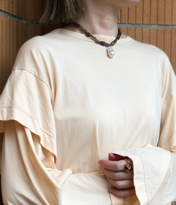 R.ALAGANから/RADZIWILL NECKLACEが入荷しました。ジャクリーン・ケネディの妹リー・ラジウィルをイメージしたネックレス。オリジナルデザインの留め具でエレガントさをプラス。歪な天然のスモーキークォーツの本体トップには扇型のパールを使用し存在感のある仕上がりに。