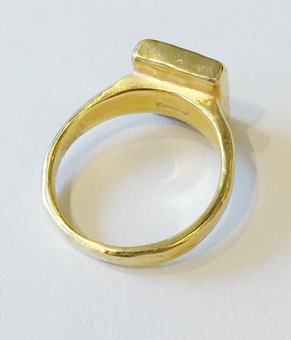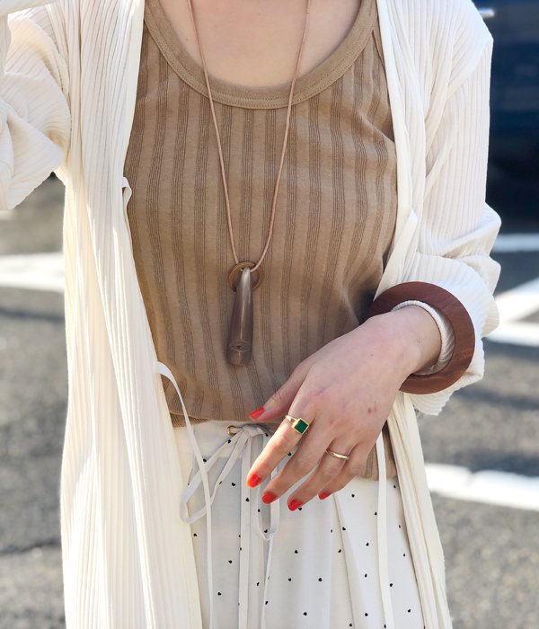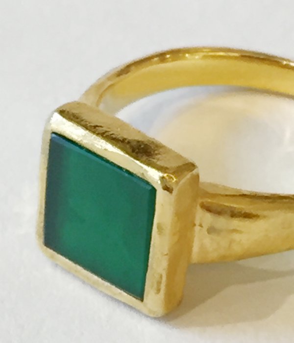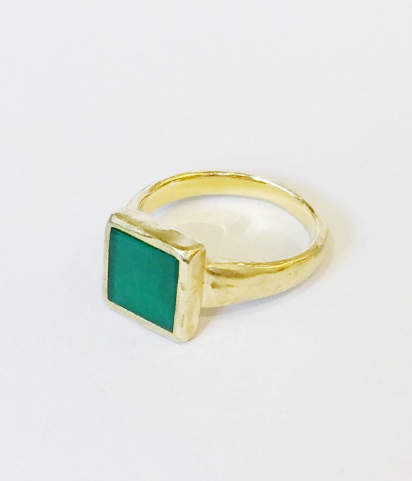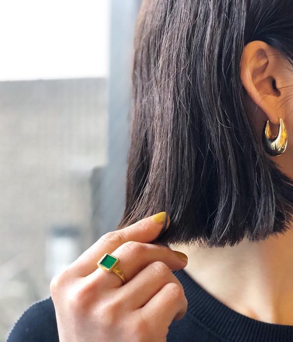 祖母の宝石箱にあるような、どこか懐かしさを感じさせる佇まいのリング。鎮座するグリーンオニキスをポイントに、普段着けているシルバージュエリーなどと合わせるスタイリングがおすすめです。
