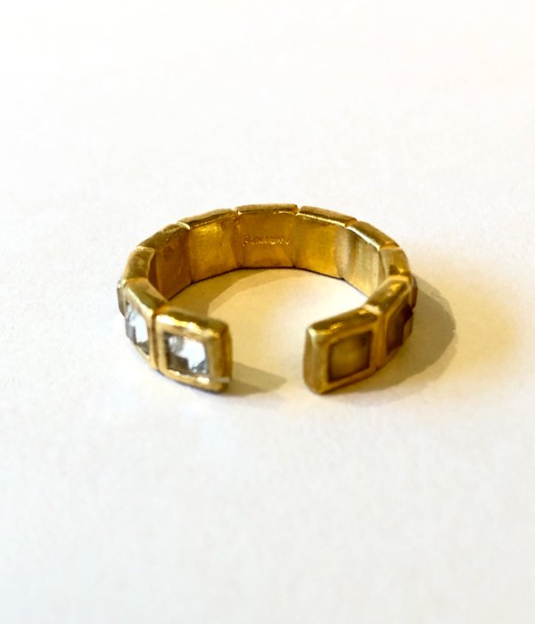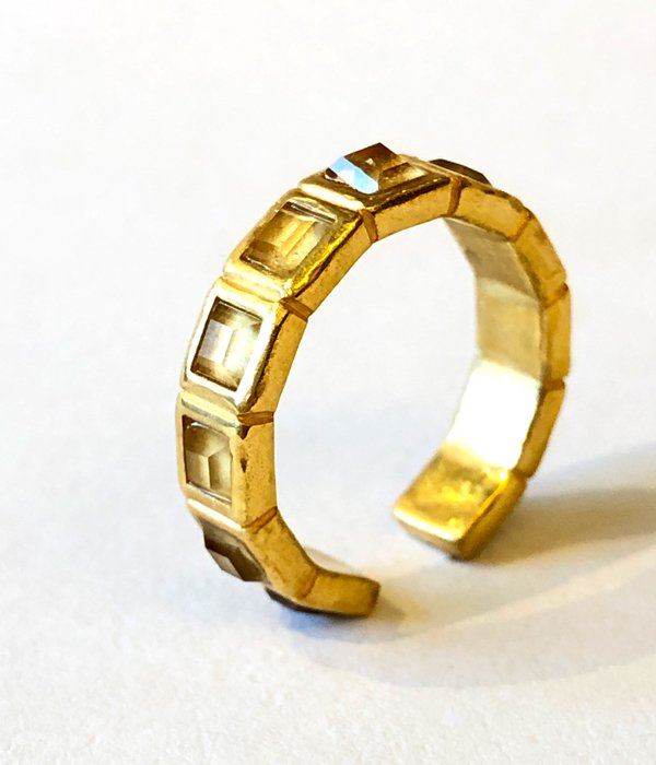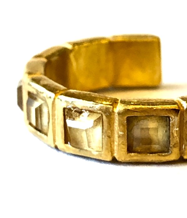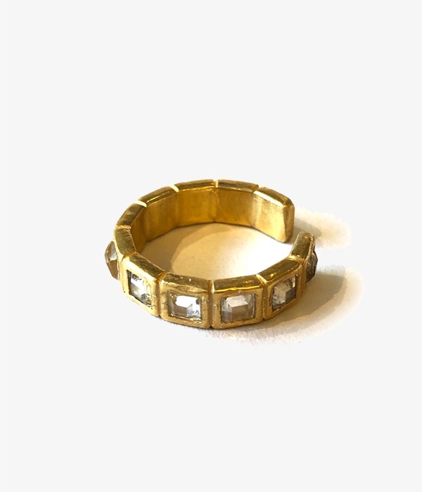 R.ALAGANからSMALL TILE RINGが入荷しました。石畳から着想のリング。細く細かくすることで繊細な雰囲気に仕上がっています。アンティーク感のあるゴールドにはめ込まれたトパーズが柔らかくあたたかな光を放ち、手元をを美しく見せてくれます。他のリングとの重ねづけもおすすめ。