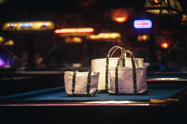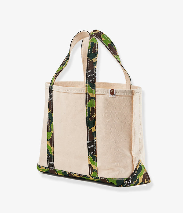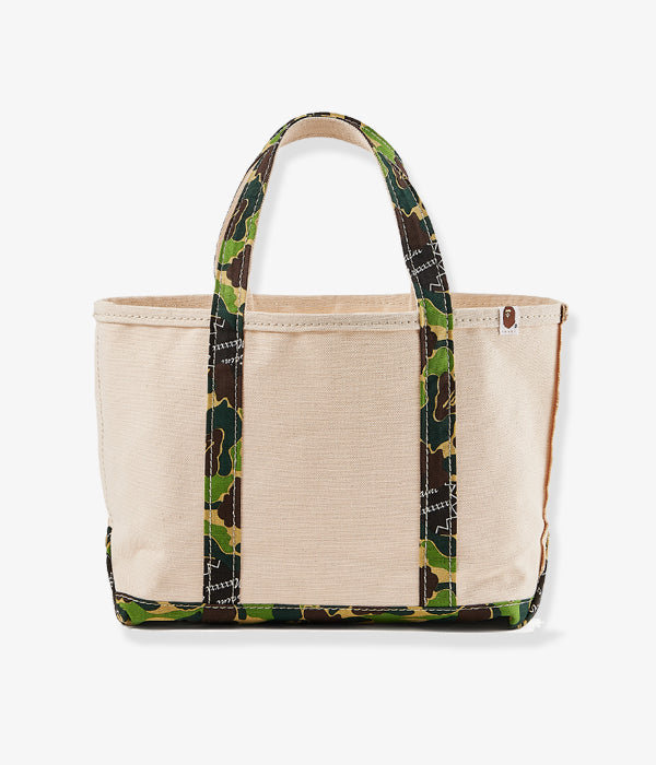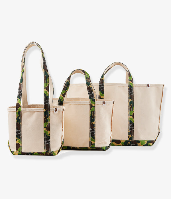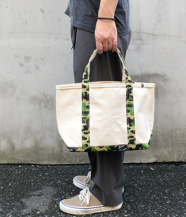 SAINT MICHAELから、AP_TOTE BAG/MEDIUM/WT+CAMが入荷しました。A BATHING APE®の30周年を祝したコラボレーションコレクションより、ハンドルとボトムにアイコニックなABC CAMO柄を使用した、2トーンカラーのキャンバストートバッグ。こちらは真ん中のミディアムサイズ。