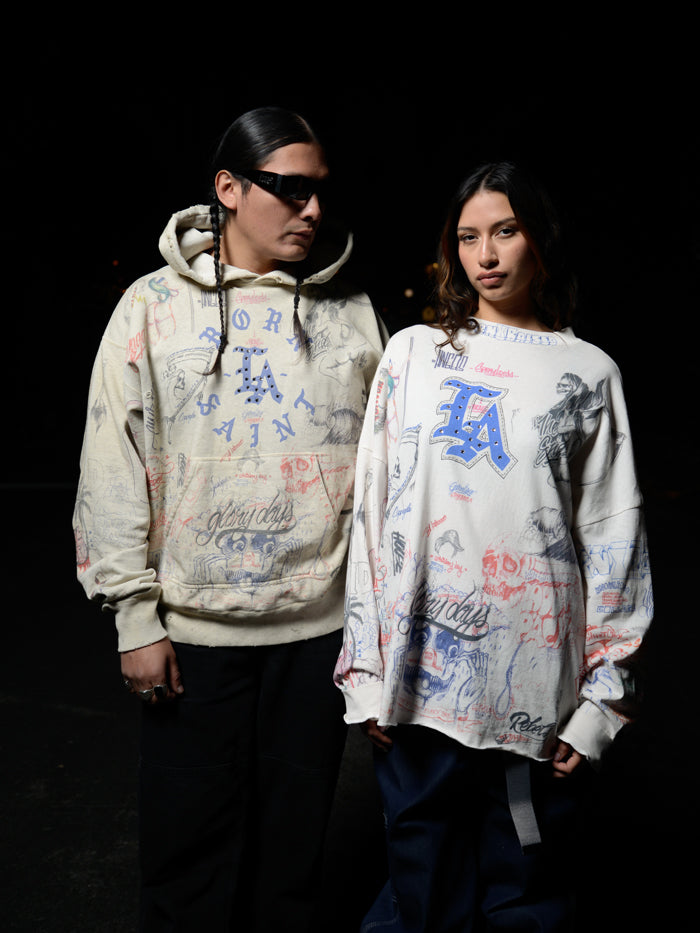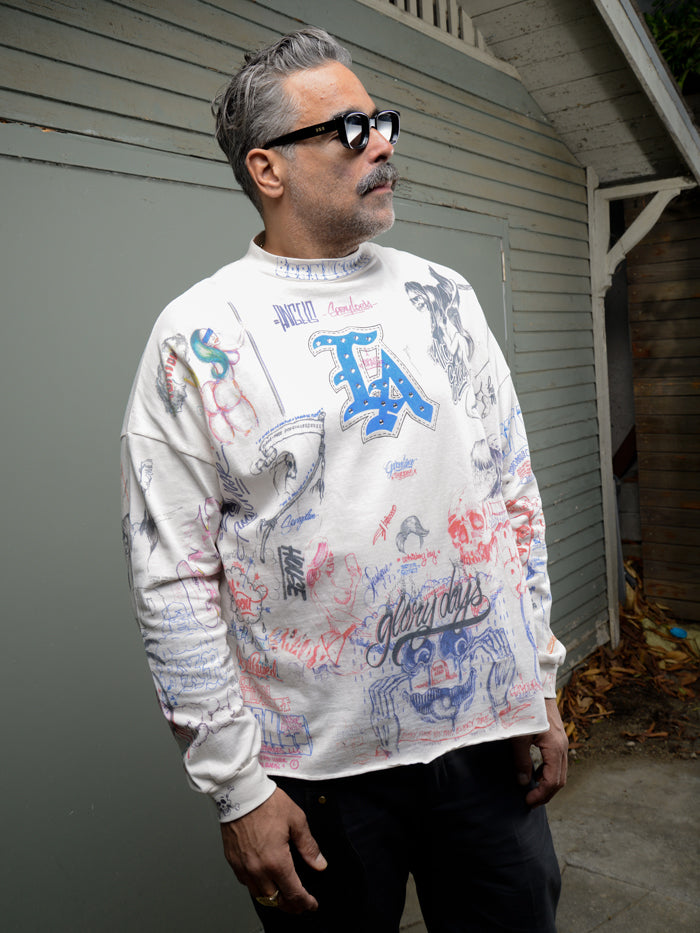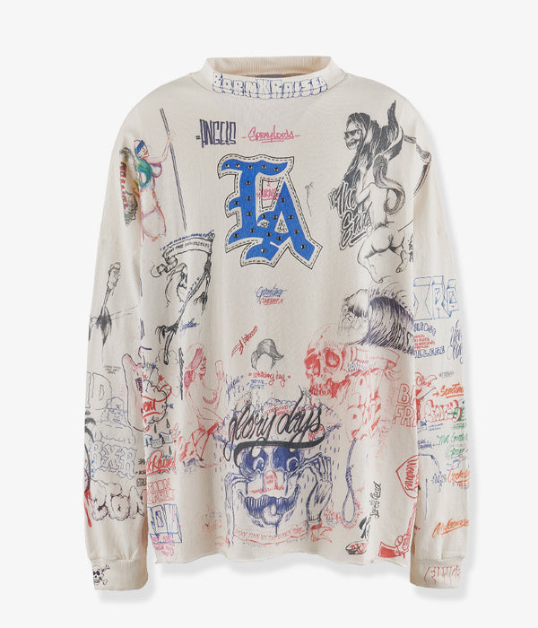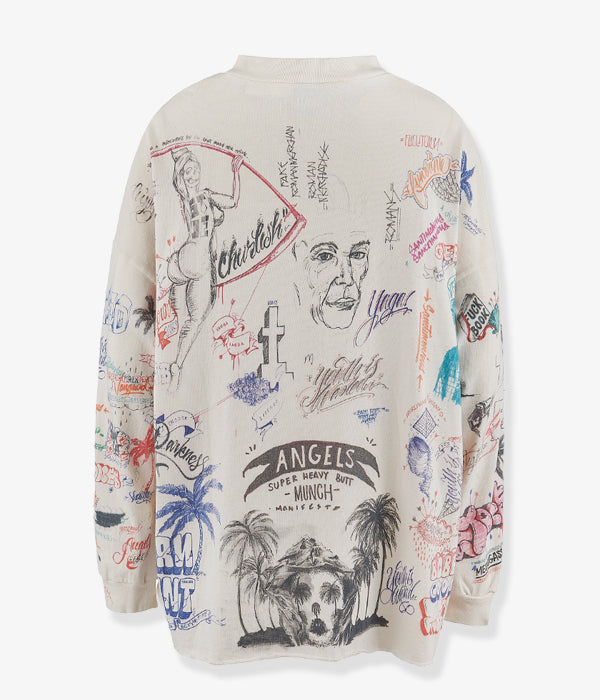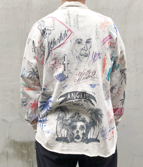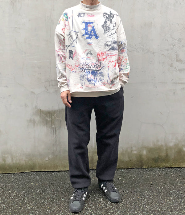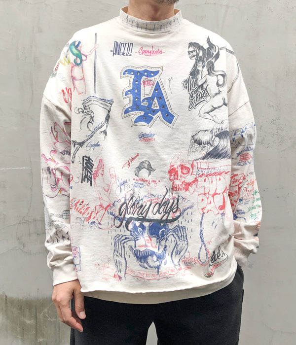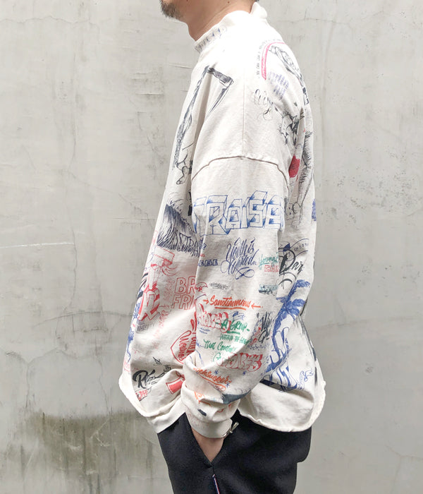 SAINT MICHAELから、BR_LS TEE/LA/WHITEが入荷しました。Born X Raisedとのコラボレーションアイテム。ラインストーンの装飾を含む、前後にふんだんにドローイングされたカラフルなデザインによるロングスリーブTシャツ。やや高めのネックリブ、断ち切りの裾周り、着古した質感に加工されたボディが存在感を放ちます。プリント入り袖リブ付き。ビッグシルエットのワンサイズの作りとなります。