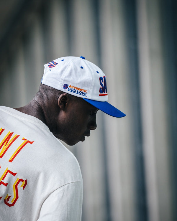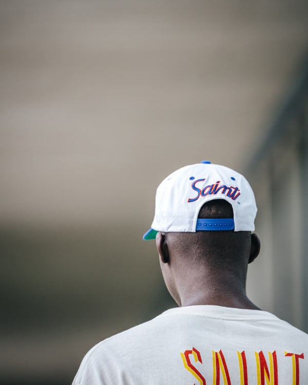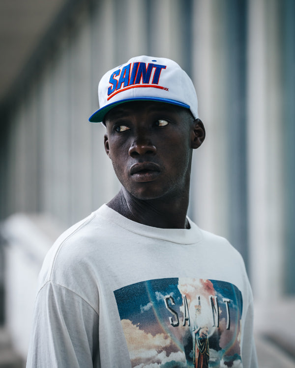 SAINT MICHAELから、CAP/SAINT/WHITE+BLUEが入荷しました。クラウンとバイザーのカラーを切り替えたデザインの6パネルキャップ。随所に刺繍で施したアイコニックなデザインがポイント。スナップバックによるサイズ調整アジャスター付き。